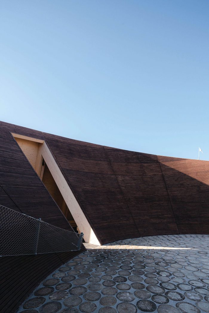 The wooden surfaces of the interiors are treated with wood oil to maintain their natural light color. Lighting is hidden in slots between the triangular parts of the frame. The deck is made of oiled pine planks, while the round yard in the middle is paved with greyed crosscut logs and white quartz sand. As a locally available material with a capacity to store carbon, wood is ecologically sustainable and long-lasting in the northern climate. It is easy to maintain and quick to repair by replacing worn-out parts. The Helsinki Biennial on Vallisaari island is part of the city’s strategy to make the archipelago more accessible.