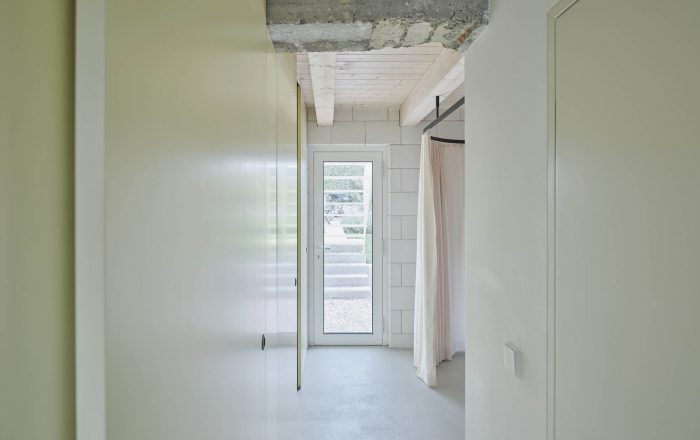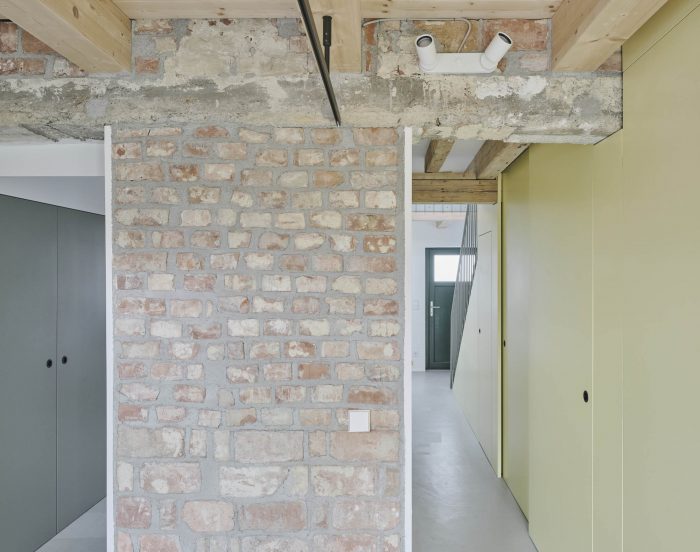 The architectural interventions reflect the basic materiality of the settlers´ house with the intention to show what this building actually is: The former exterior wall became an interior wall and its economic “rat-trap” brick bond, arranged by the settlers, was made visible. The - at that time highly innovative - pre-fabricated wood-concrete elements of the flat roof were exposed and painted white. Similarly comprehensive materials were added: sand-lime brick masonry, wood-beamed ceilings and plywood walls. The colors of the materials were supplemented by elements in grey-green and light yellow.