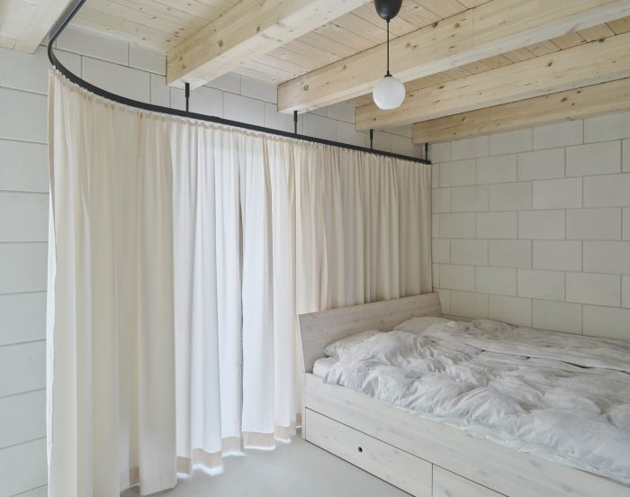 建筑干预反映了定居者房屋的基本材料性,目的是为了显示这个建筑实际上是什么。以前的外墙变成了内墙,由定居者安排的经济的 "捕鼠器 "砖块被显示出来。当时高度创新的预制平顶的木质混凝土构件被暴露出来并涂成白色。类似的综合材料也被添加进来:沙灰砖砌体、木梁天花板和胶合板墙。这些材料的颜色由灰绿色和浅黄色的元素来补充。