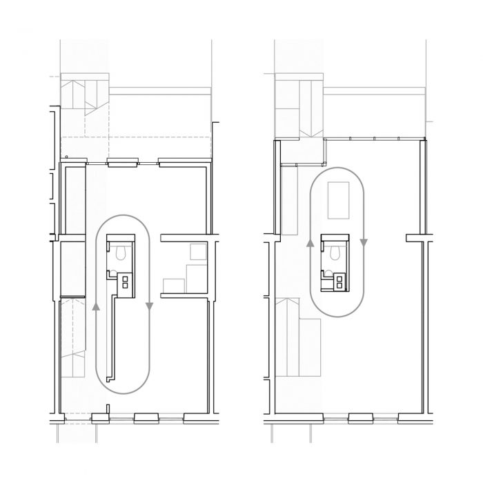 Continuing the history of changes and adaptations, the 70m² house, which is still inhabited by the same family, was internally re-organized and extended at the garden side by a two-story annex. The private rooms are now situated on the introverted ground floor, while the first floor opens up for generous living with wide views and a lot of light. A new linear space connects the front and back side of the house on both levels, provides access from and to the street, the backyard and the garden and offers views through the house. The floor plans are defined by only a few fixed components and allow for circular movement on both levels. Several movable elements on the ground floor provide for a fluent interpretation of space and differentiated grades of privacy.