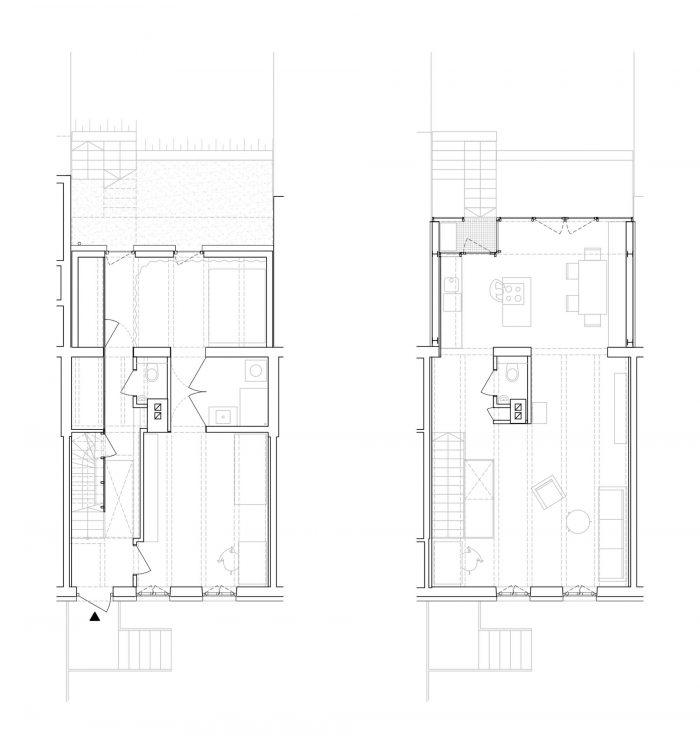 延续变化和调整的历史,这所70平方米的房子,仍然由同一个家庭居住,内部被重新组织,并在花园一侧扩展了一个两层的附属建筑。现在,私人房间位于内向的一楼,而一楼则为宽敞的生活空间开放,视野开阔,光线充足。一个新的线性空间连接了两层房屋的前部和后部,提供了进出街道、后院和花园的通道,并提供了贯穿整个房屋的视野。楼层平面图仅由几个固定的组件定义,并允许在两层进行循环运动。底层的几个可移动元素提供了一个流畅的空间解释和不同等级的隐私。