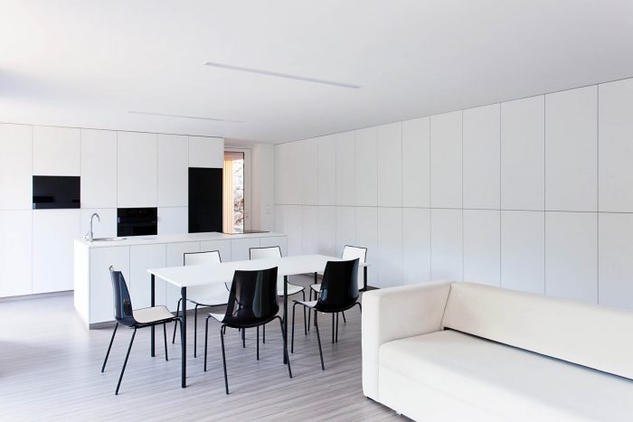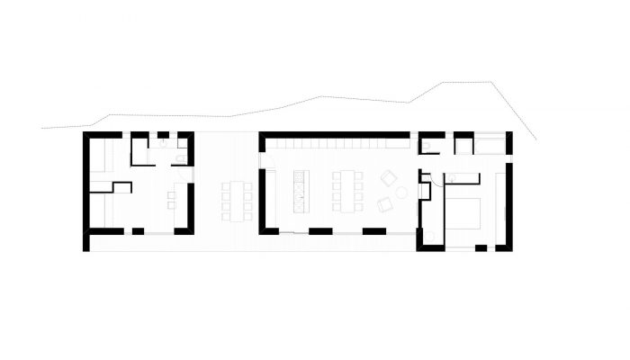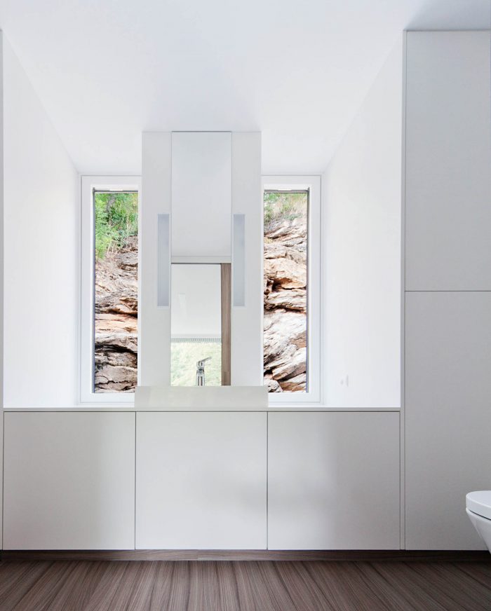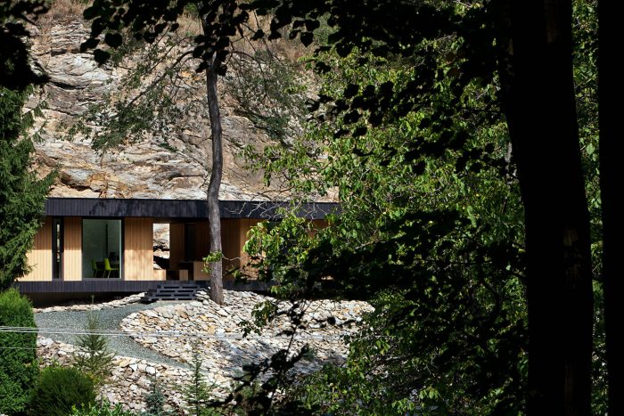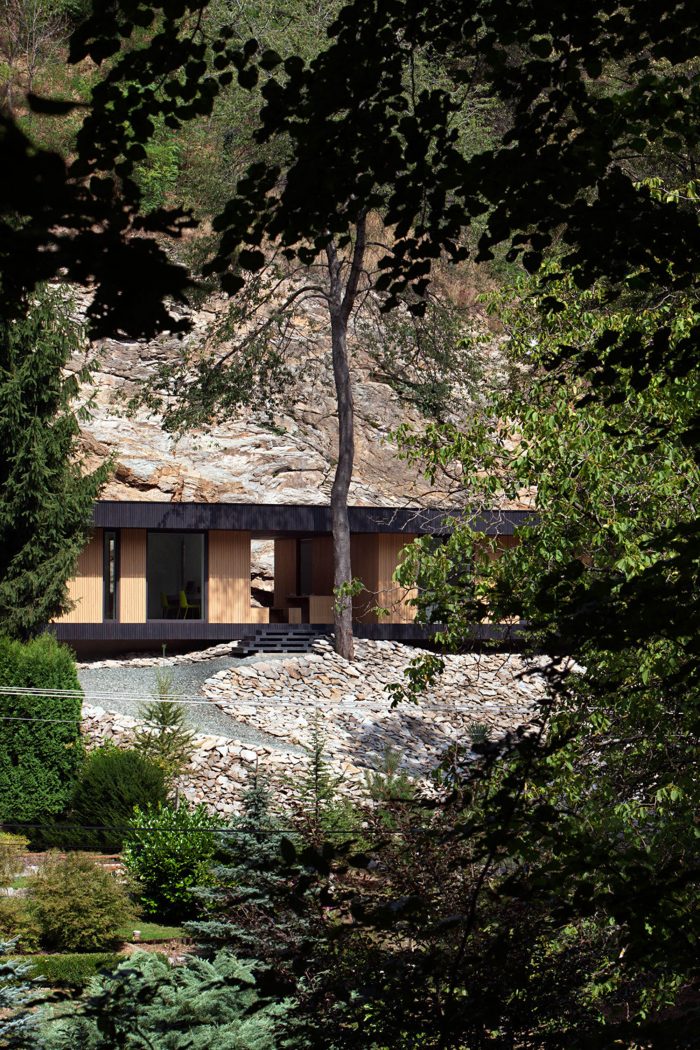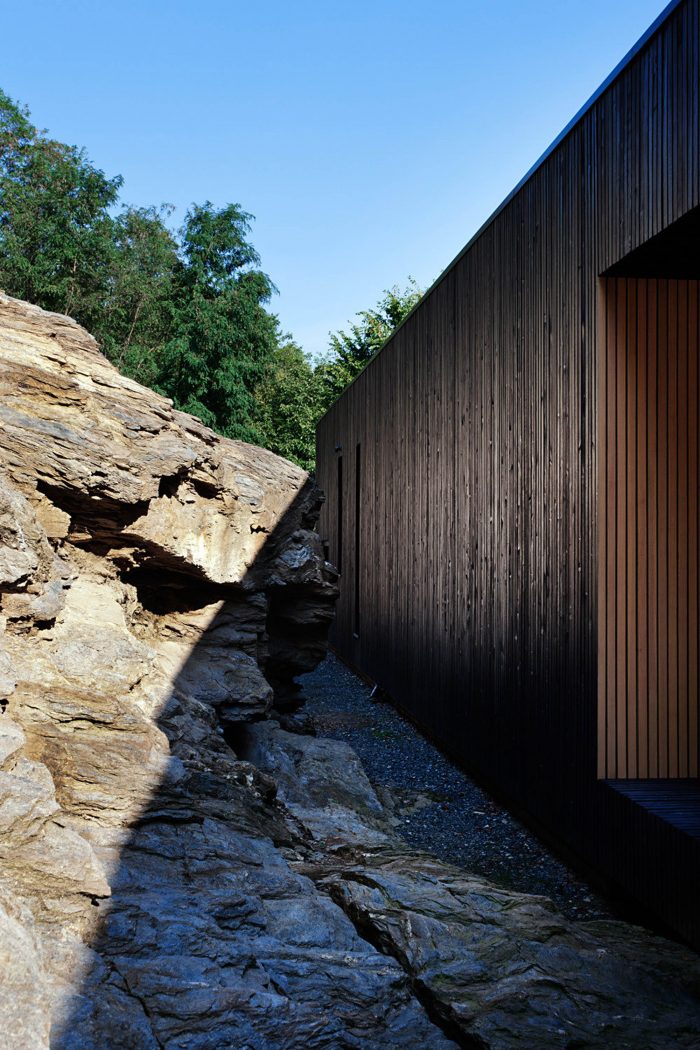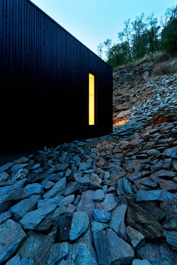 The site had been used as a quarry a few cenutries ago so the exposed rock face was one of the strongest elements of the environment. In order to get enough direct sunlight all-year-long and to stay close to the sculptural cliffs, the building had been placed about 10 meters above the road that runs along the bottom of the valley.