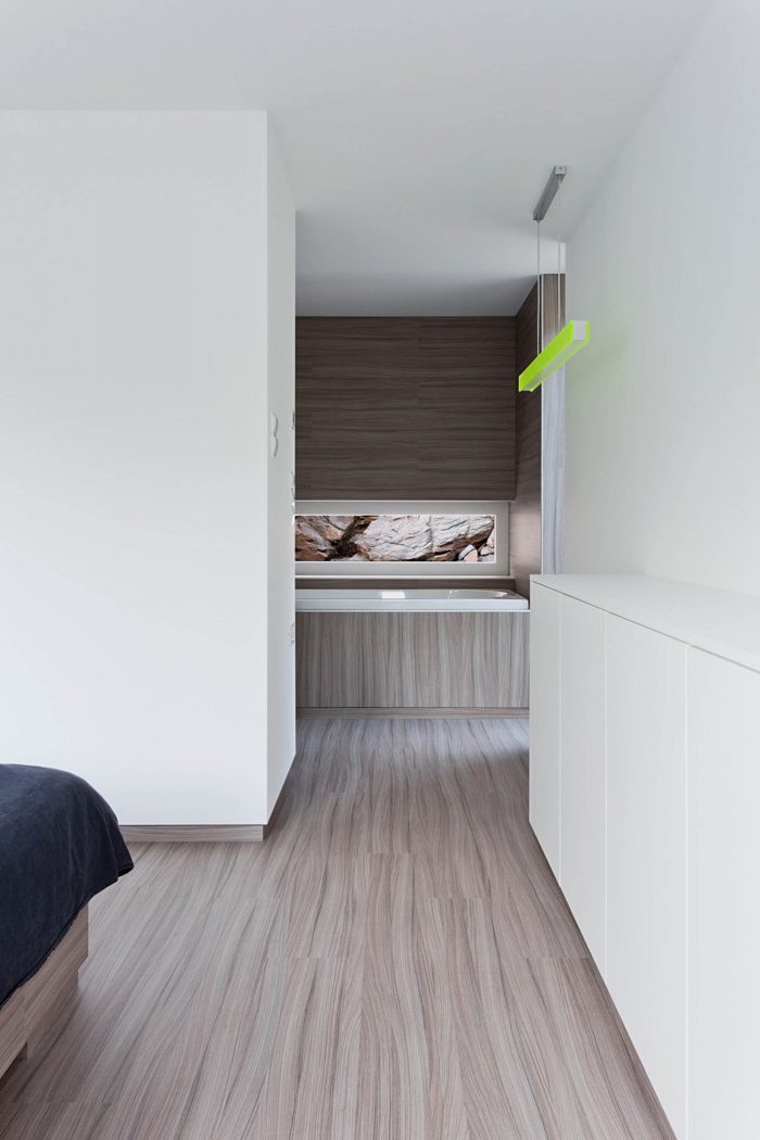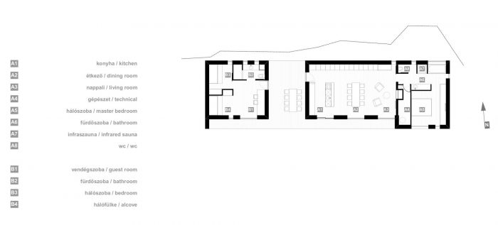 Natural lights and views to the surrounding nature were the most important factors at the arrangement of spaces. The solid and open surfaces of the 110 sqm building react to these elements as well - large but shaded openings towards the best views on the south side, glimpses of the rock from accentuated spots on the north.