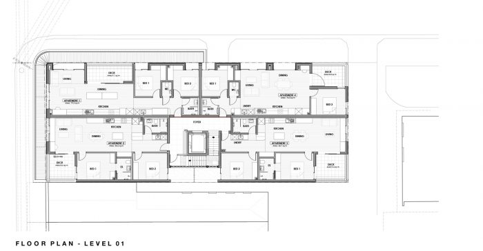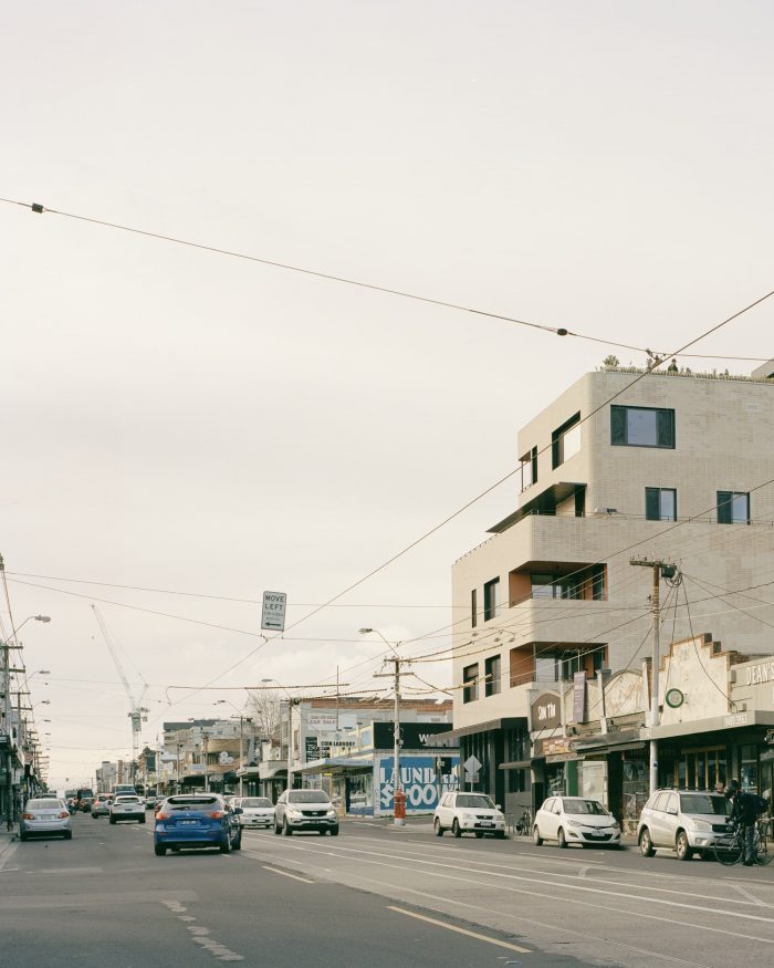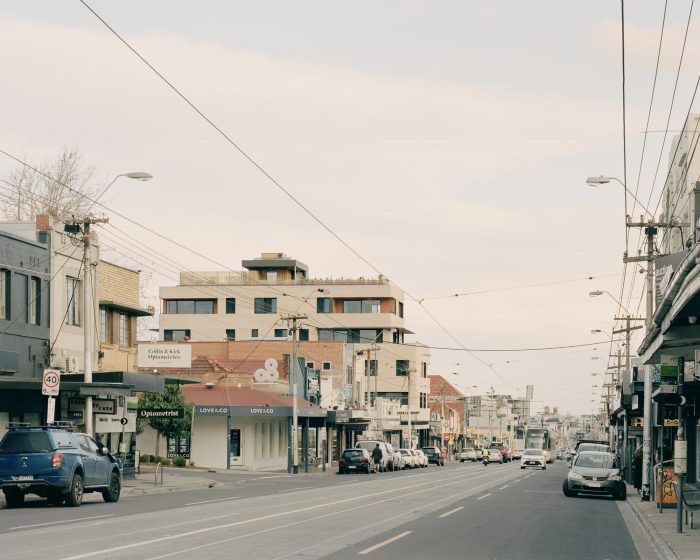 The High Street Apartments is Gardiner Architects’ first high-rise multi-residential project. Located in Thornbury, Melbourne, the project is a mixed-use building, with thirteen apartments above a ground floor carpark and restaurant fronting High Street.