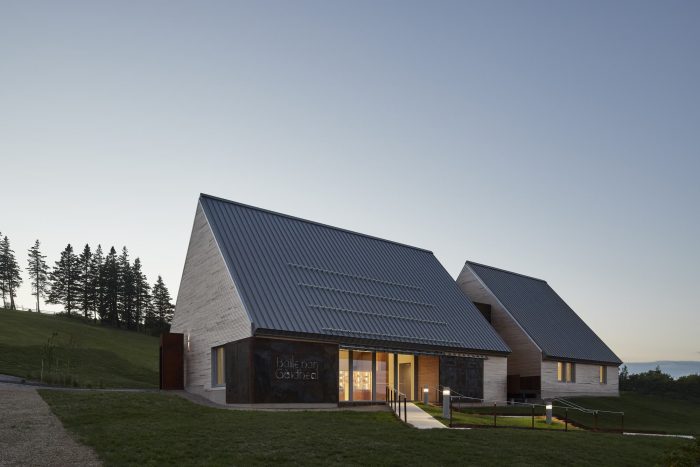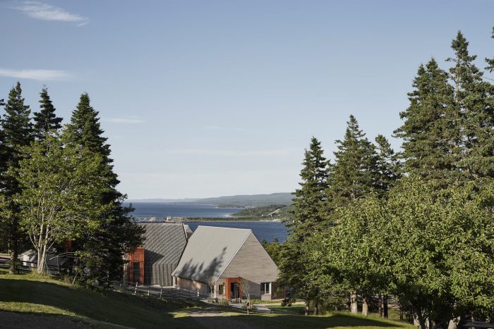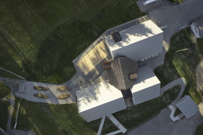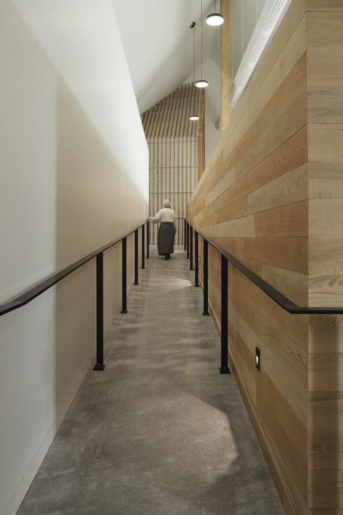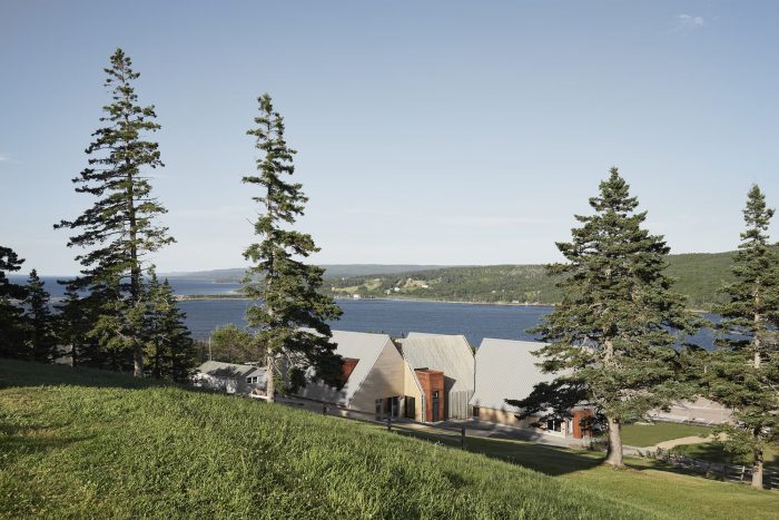 The vegetative exterior material of the original black house typology is flipped to the interior with fibrous wood panels, which double as an acoustic treatment. A replica of an actual Hebridean black house is also located on the museum site. This is the first public-sector project in Nova Scotia designed with Passive House strategies including super-insulated walls and roofs, triple-glazed high-performance windows, and an ultra-efficient heat recovery system.