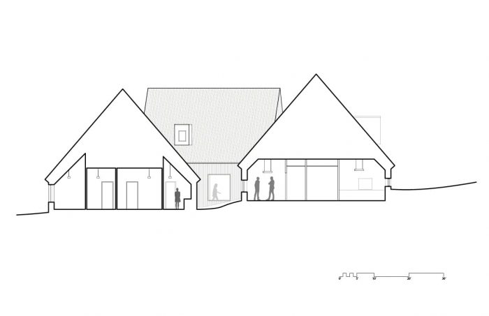 The fourth, middle volume, concealed and set on its own axis, is the metaphorical heart of the complex, containing the core exhibitions and the genealogical library. An inversion of the traditional black houses of Scotland, where the wood interior is presented on the full exterior of the building, using local spruce boards, on edge and spaced.