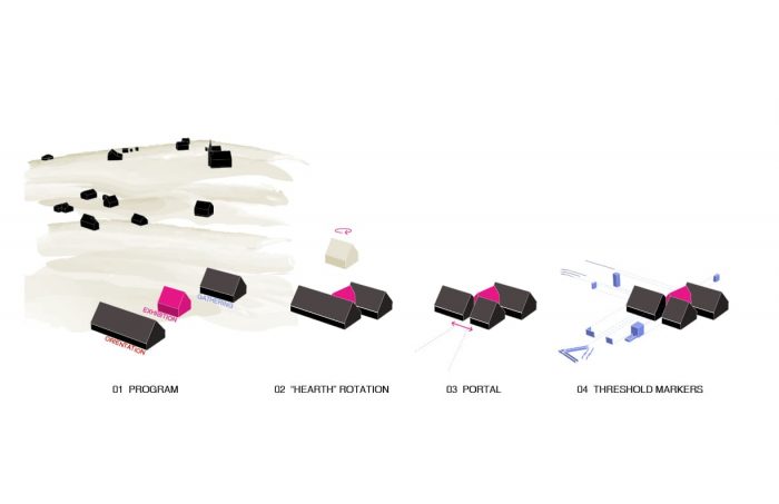 The intent of the Museum as a whole, and the new Centre in specific, is to draw the visitor along a chronological thread weaving through successive historic periods and cultural contexts. The design of the new Interpretive Centre delineates this time travel through a path that weaves in and out of a series of distinct but repeating building volumes. The volumes themselves form a gathering of repeated quasi-vernacular forms analogous to the Highland Village itself.