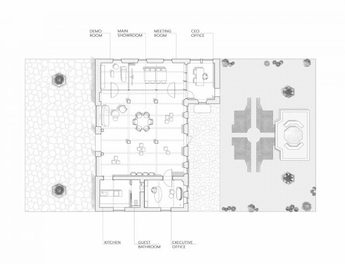 Back in the introduction and initial planning phase, the owners of the Innovative cosmetics company Hikari, presented the importance of finding solutions for all the variety of uses that the space will serve the company in the future. Such as guidance for beauticians, a meeting room for staff, diverse seating areas and entertainment, a CEO room with access to space control, a guest restroom, and a kitchenette.