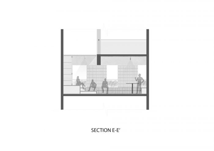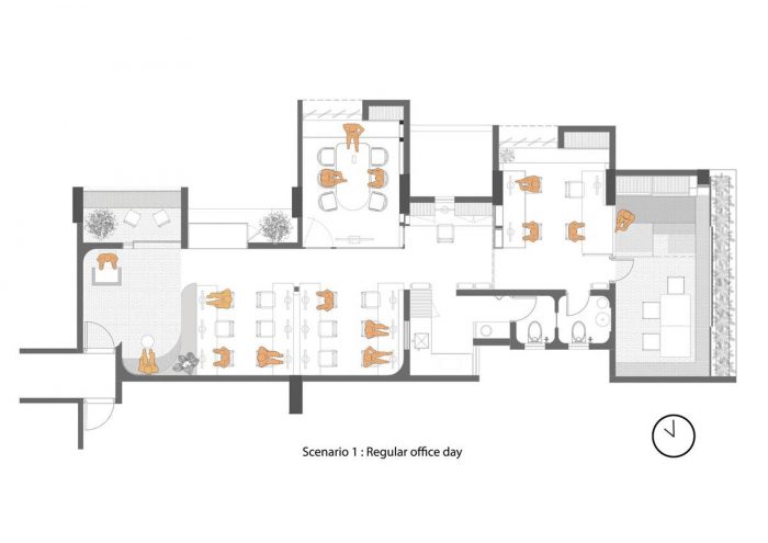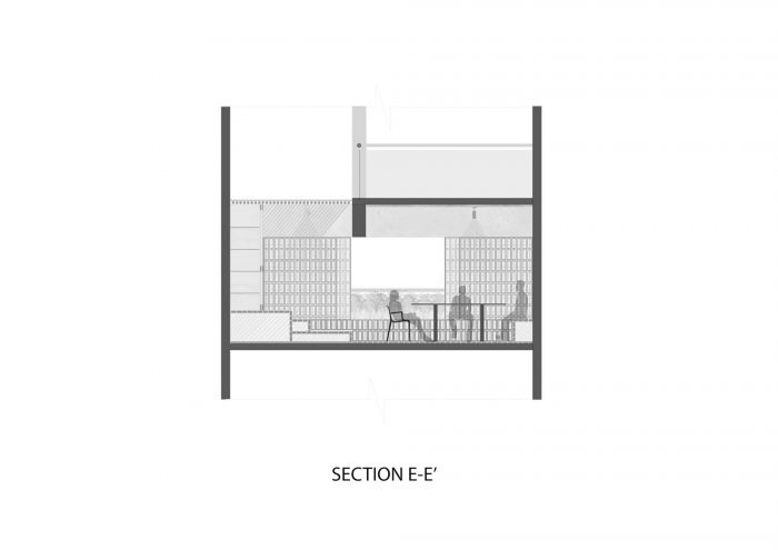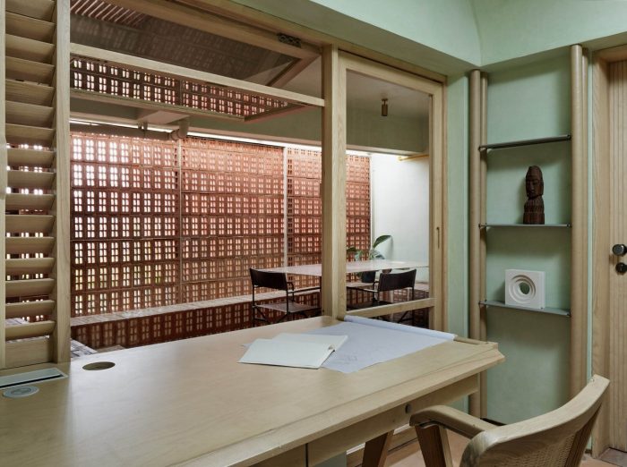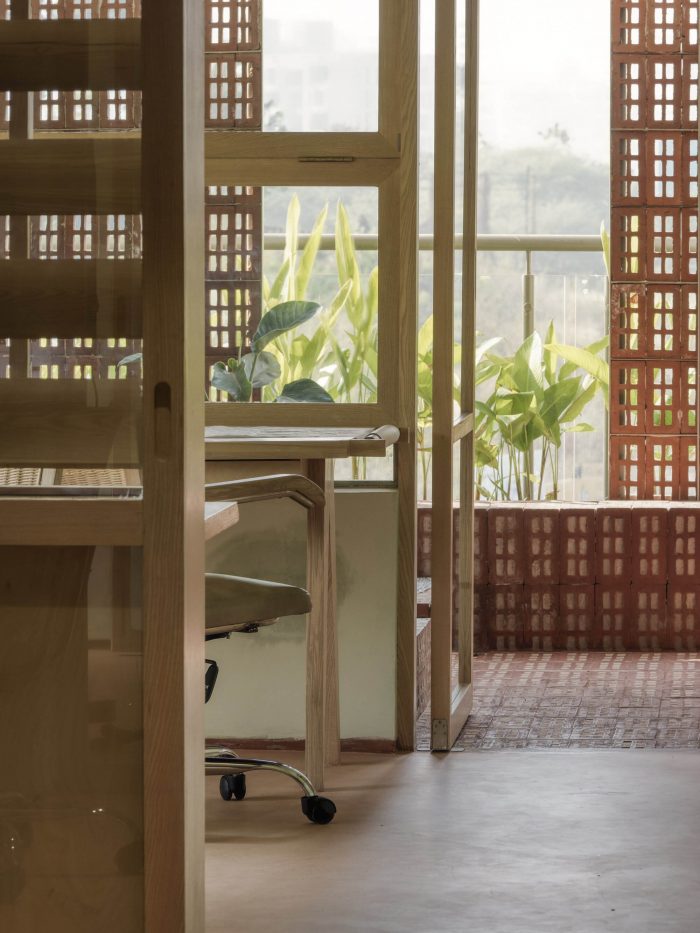 The entrance zone in the open floor plan is signified with natural brick paving terminating into a built-in reception desk creating a sense of arrival, same brick floor seamlessly continues to the terrace to create a sense connect with the outdoor. Perforated brick sliding panels control the entry of southern sun rays into the multipurpose space used for informal meetings, brainstorming sessions, dining etc.