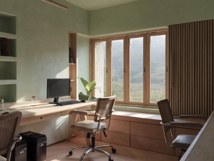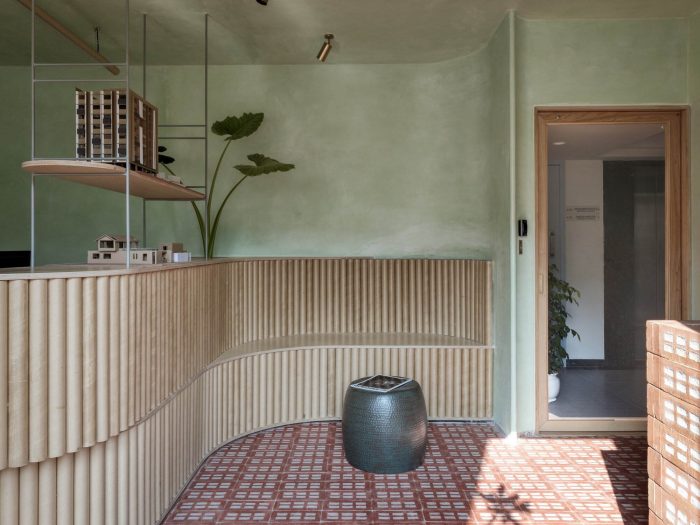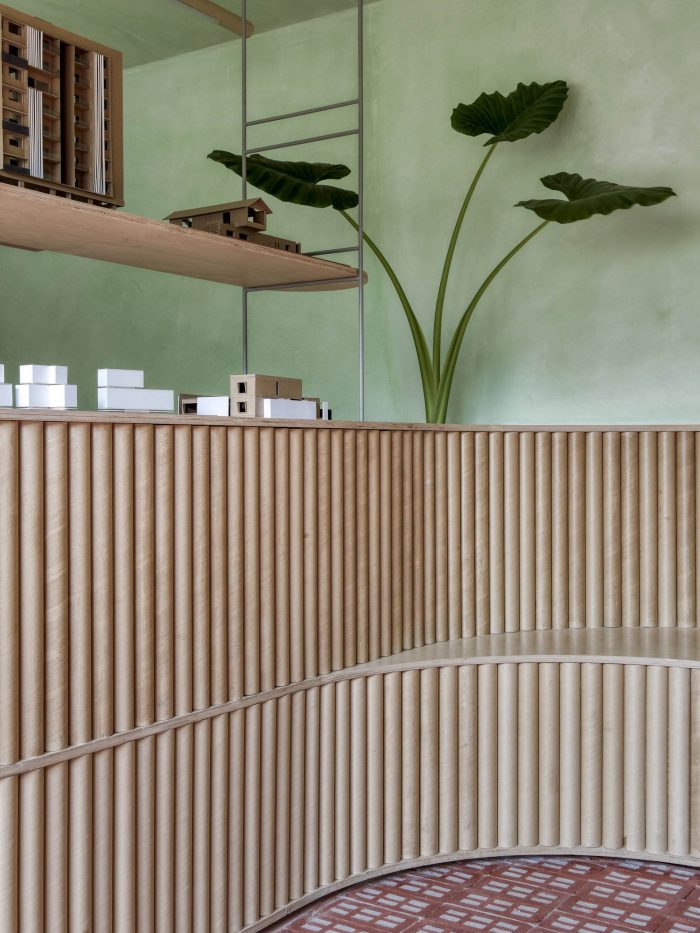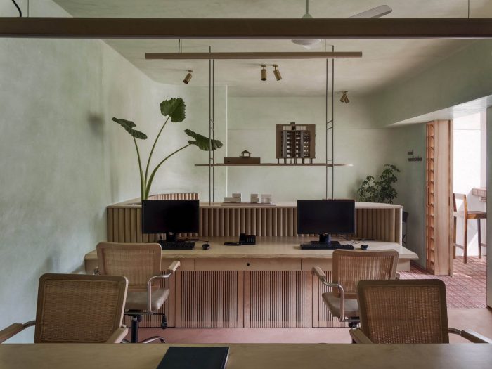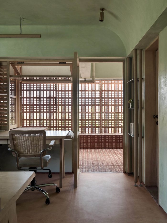 The Palette - Material selection as light oak wood furniture, In-situ concrete floor, natural brick paving with tall seamless walls, and ceilings in pastel green lime plaster finish is the result of the desired peaceful working environment. Recycled paper tube, an eco-friendly material, is explored to be used in various interventions such as sliding or operable shutters, seating backrests, or open shelves supported with customized detailing.