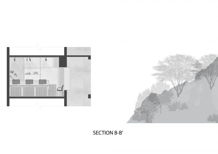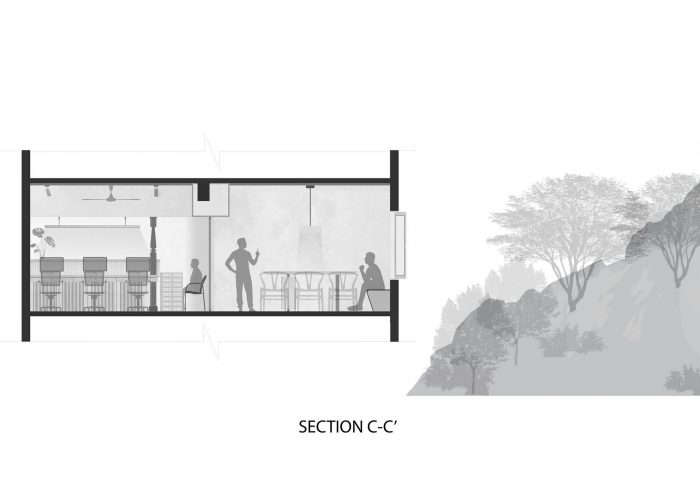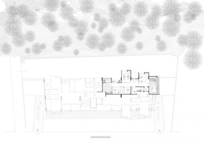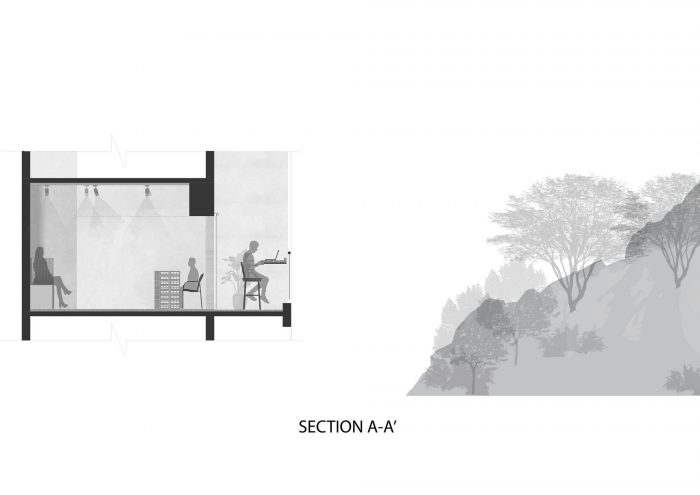 Site - The floor plate of 120 sqm is kept open and free with functions planned suitably with minimal clear glass partitions as per necessities. Required fluidity is achieved in a rigid framework with subtle curvilinear treatment to corner junctions. The spaces are planned or styled to surrender to the adjoining hill, the material palette is tastefully chosen to match with different shades of the hill throughout the year. Thus, nature flows to the indoors, and space becomes part of nature and vice versa. Climatically, most of the spaces facing or opening towards eastern hill help to keep the areas well lit with natural light coming in without the extra glare and heat throughout the working hours.
