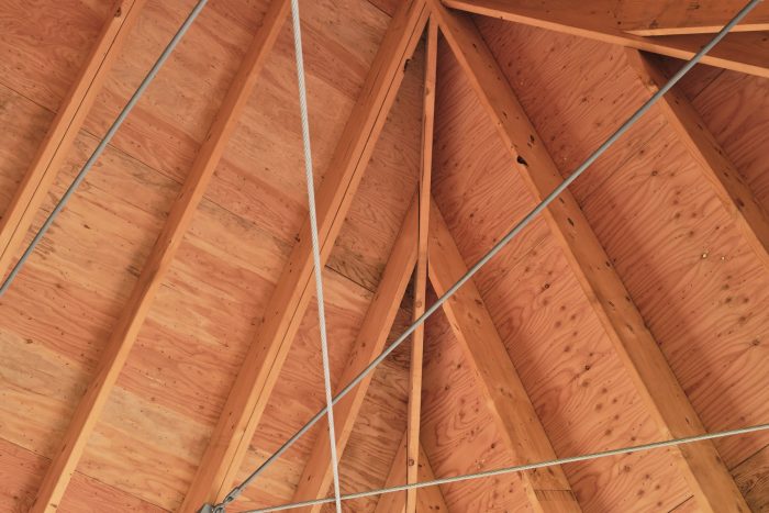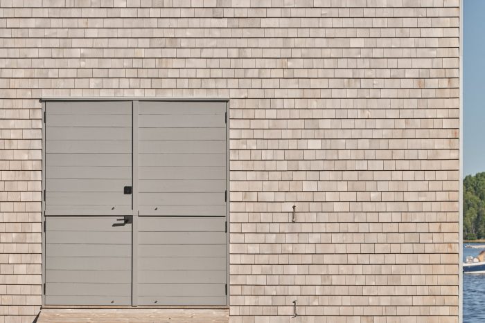 这两个船库的功能决定了在木材类型、饰面和支撑方面有两种不同的设计和结构策略。门廊屏风区的墙壁和地板要暴露在天气和海洋风暴中,需要一种能在盐碱环境中保存下来的抗腐木种。因此,前廊区域的设计采用实心铁杉木和横梁,实心粗锯铁杉木装饰板,外露钢制横撑,没有层压木制品。天花板是暴露的结构,有暴露的拉杆。内部的船库是2 x 6的木墙骨结构,不会暴露在天气中,并提供胶合板单板包覆的天花板和墙面,铺设磨光铁杉木地板。