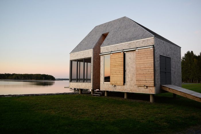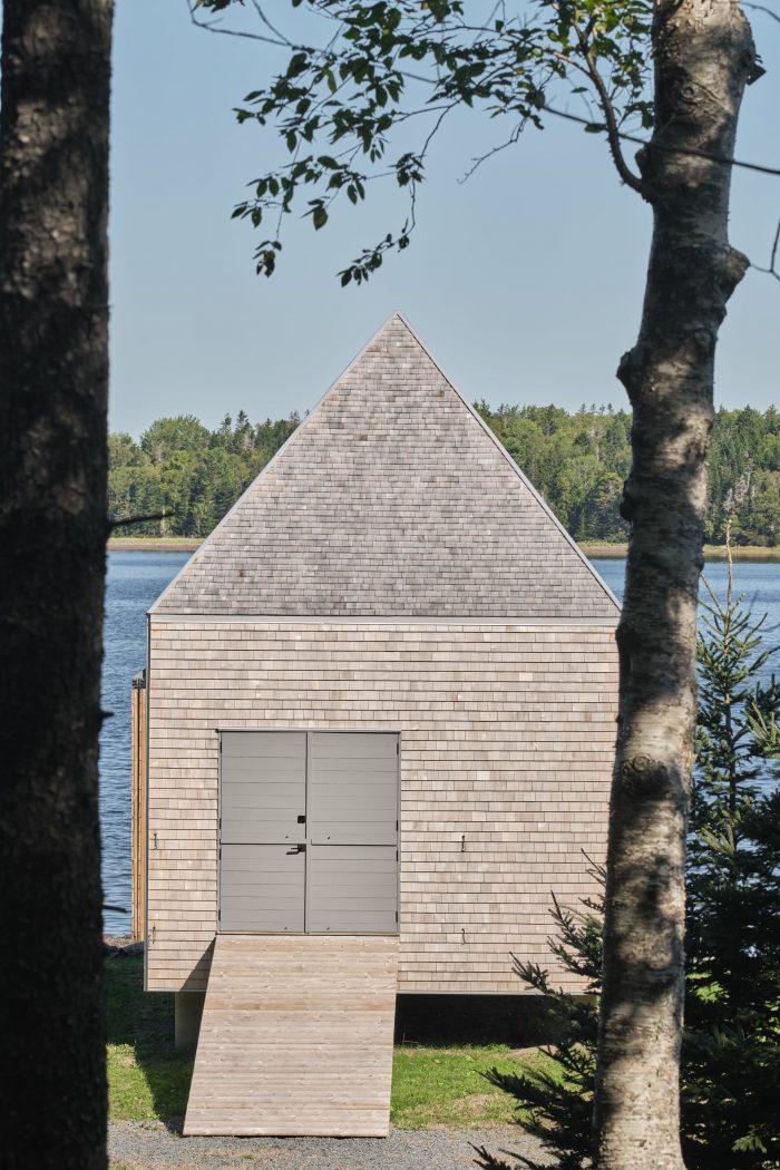这个地方位于新斯科舍省南岸的赫尔曼岛,沿着一段偏远的海岸线,背对新斯科舍省的马洪湾。在这个偏远的地方,沿着这块地的朝西的森林海滩边缘,他们想创造一个既能储存船只的功能空间,又能与水和西部的日落联系起来的休闲、禅意的地方。规划限制将海边的开发只限于船屋。这一限制在设计中被接受,作为一种重新加强结构和选址的元素、海洋性质的方式。