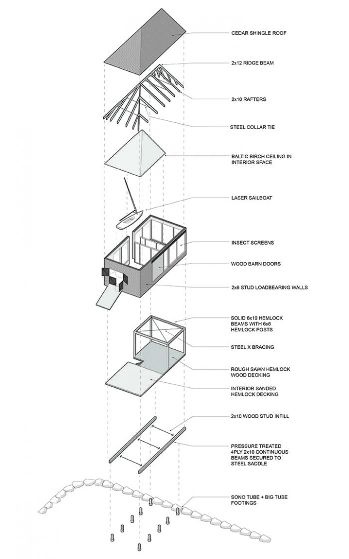The elevations are allowed to respond to site conditions: minimal openings on the north side, maximum openings on the south side to take advantage of sun. A deep cut in the south elevation contrasts and emphasizes the mass of the volume, while admitting a concealed stair up into the middle of the plan which bisects the two functional zones. The building is set on stilts hovering above the high-water line, with the front porch cantilevering over the beach edge. The viewing porch faces out to the water, with boat storage behind.
