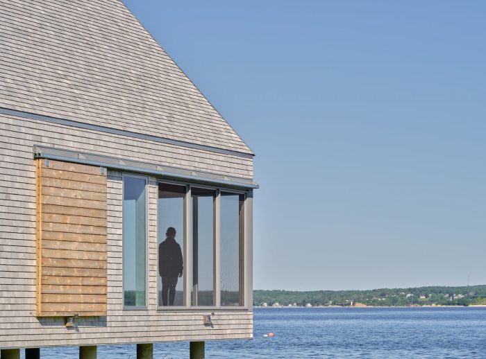 This site is located on Herman’s Island, on the South Shore of Nova Scotia along a section of remote, shoreline facing back into Mahone Bay, Nova Scotia. At this remote location, along the forested west-facing beach edge of the lot they wanted to create both a functional space for boat storage and a leisurely, Zen place for connecting to the water, and the western sunsets. Planning restrictions limit ocean-side development to boathouses only. This restriction was embraced in the design, as a way of re-enforcing the elemental, maritime nature of the structure and the siting.