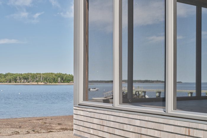 The two boathouse functions dictated two different design and structural strategies in terms of wood types, finishes, and bracing. The porch screened area walls and floors are to be exposed to the weather and ocean storms and require a rot-resistant wood species that can be preserved through the saline environment. As such the front porch area is designed with solid hemlock timber and beams, solid rough sawn hemlock decking with exposed steel cross bracing, and no laminated wood products. The ceiling is exposed structure with exposed tie rods. The interior boat storage area is a 2 x 6 wood stud construction that will not be exposed to the weather, and is provided with a plywood veneer clad ceiling and walls with a sanded hemlock wood flooring.