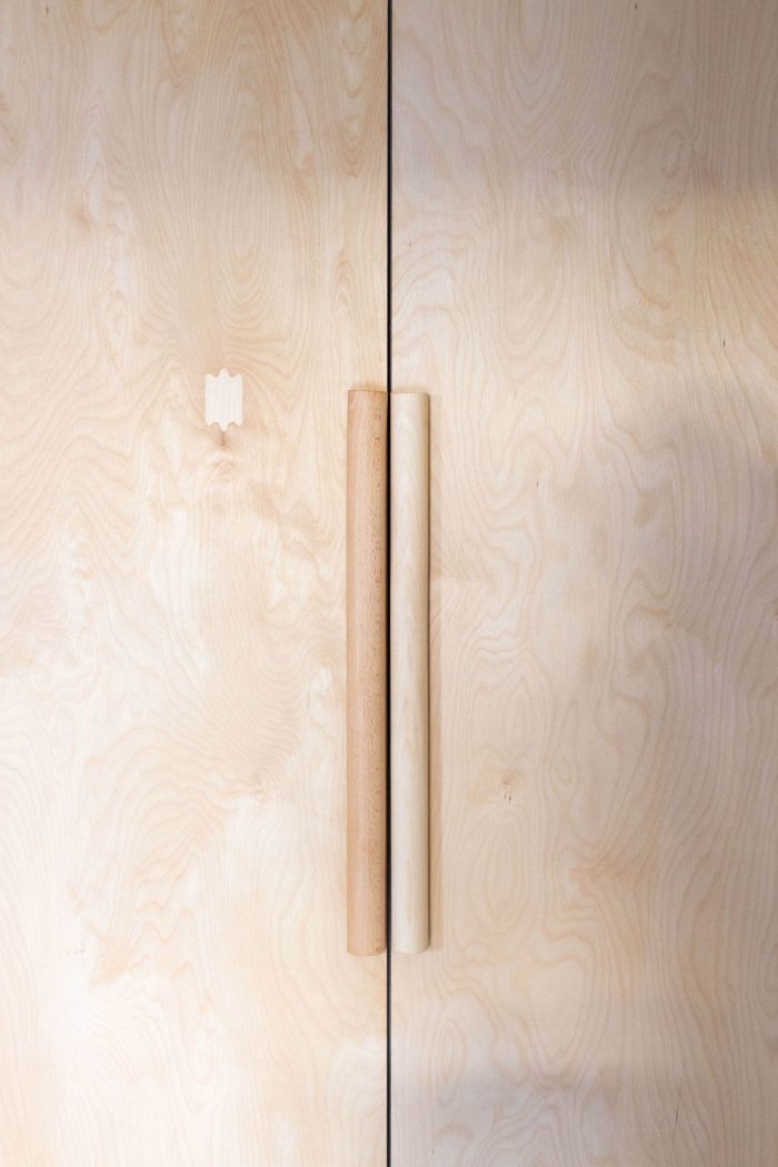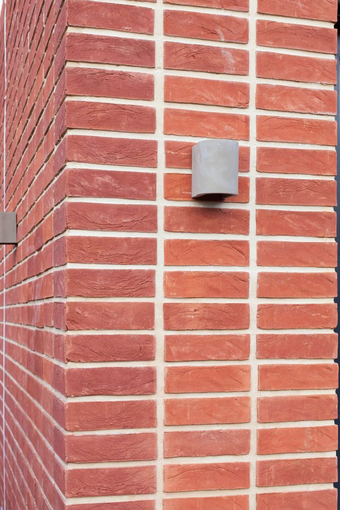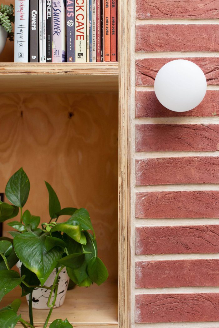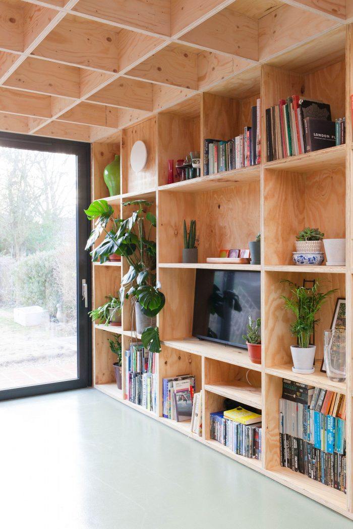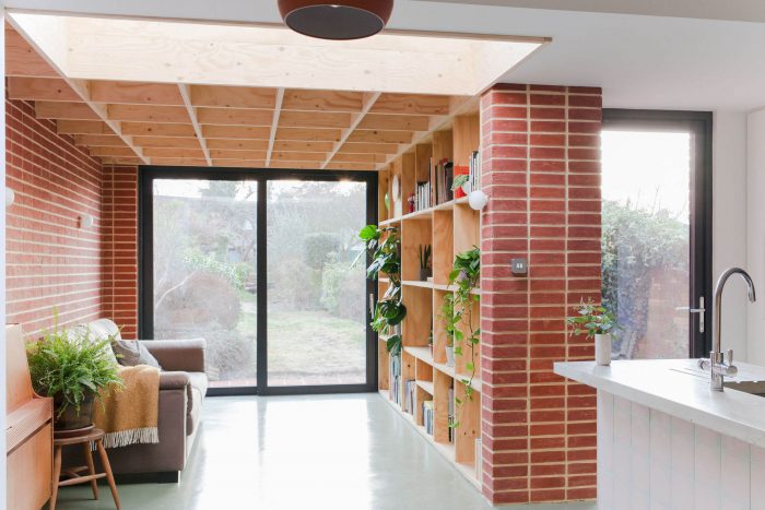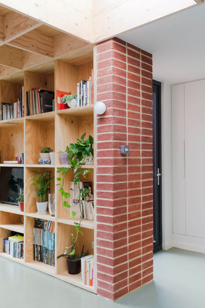 A timber structure of exposed structural plywood was used for the extension to reduce steelwork costs and provide something that could act as both structure and exposed internal storage. This lightweight timber grid was then draped in a skin of red brick to provide external cladding and robustness where required. The bricks are constructed using a stack bond with a light, recessed mortar accentuating the geometry of the materials and referencing the structural timber grid internally.