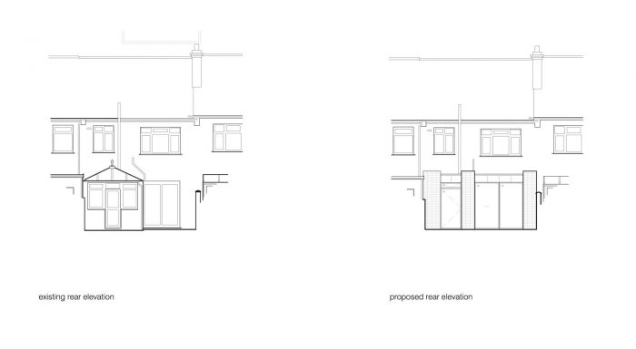 The rear extension is stepped in plan at the rear to respond to existing extensions on either side and reduce impact on neighbours. It creates a new family space by combining the existing rear living room and kitchen with the new additional space to provide kitchen, dining and living areas, each subtly defined within the larger space.