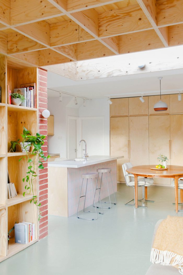 扩建部分使用了裸露的结构胶合板的木材结构,以减少钢结构的成本,并提供一些既能作为结构又能作为裸露的内部存储的东西。这种轻质的木格子随后被铺上一层红砖,以提供所需的外部覆层和坚固性。砖的结构是使用堆积键,用浅色、凹陷的砂浆突出材料的几何形状,并参考内部的结构木格。