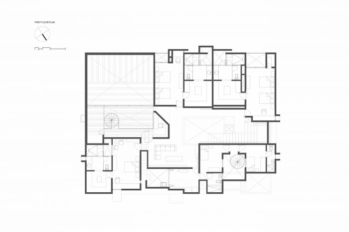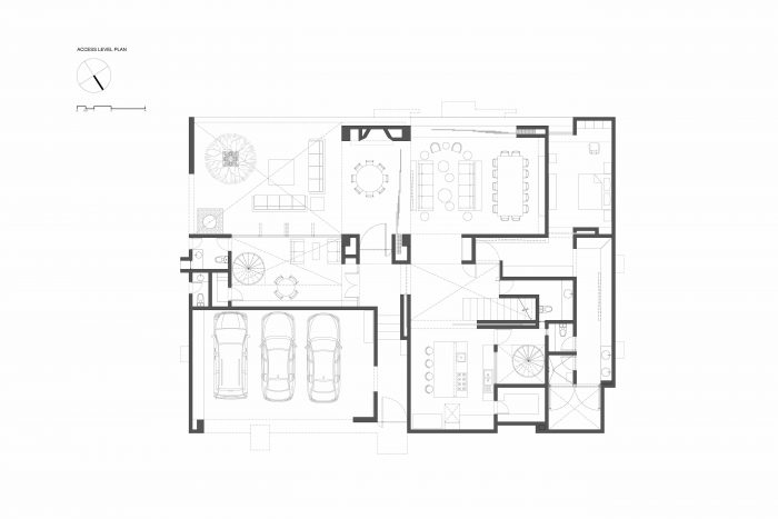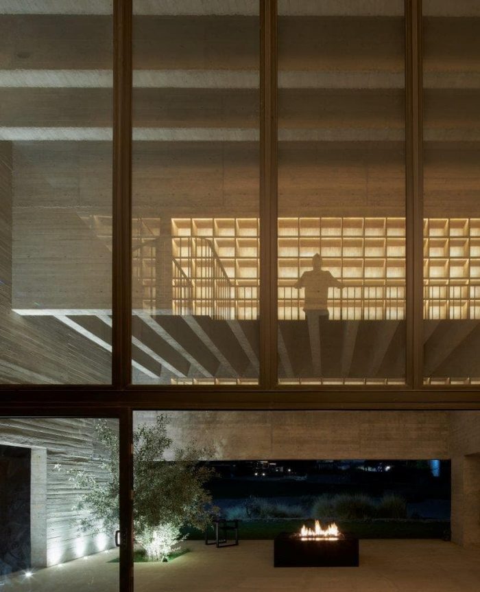 So in this case, more than rooms and bathrooms, a library, a dining room, a kitchen, laundry, a room, etc.. All the spaces are connected with a path, a designed path. Very curious to see and feel the family's happiness towards the project because of these spaces. Of course, they love what they ask for. Still, all these new ways to approach space in terms of lighting, pathways, silence, sobriety, dramatism, and many other romantic ways to approach a building, make this house a very special spot to be lived and shared more than before in their lifetime. It is also a house that lives inwards. Although every space has views of the golf course and has many ways to open the whole floor plan in order to have a connected space, it is a house that has to be discovered. We have never been fans of being looked at from the outside, and it is one of the things that is accomplished as a key concept. And last but not least, we think we have moved a step forward in getting close to sculpture. Architecture as sculpture has been the most important theme in the lifetime of the office.