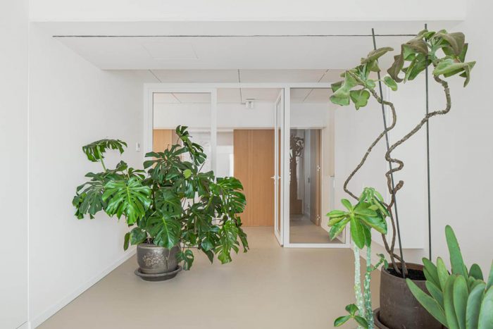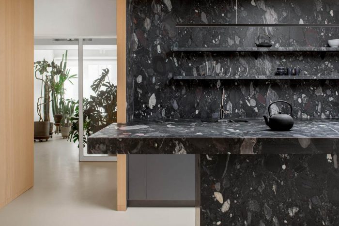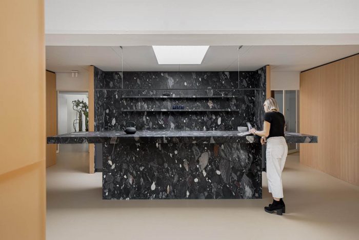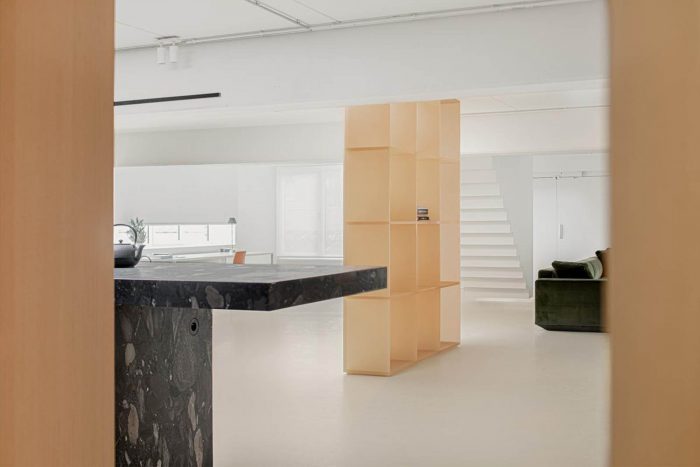 The elements in cast polyester are the result of a creative collaboration with Werkplaats Vincent de Rijk. The other floors of the building are currently being used by the artist as office, workplace and atelier. The materials and the position of the interventions were carefully determined to create a meaningful composition with the existing skylights. The definition of the different spaces follows the structure of the beams. The translucent material of the central cupboard absorbs the light from above and diffuses the daylight in the open space. The material of the kitchen is a very textured and dark marble, creating a bold centre point in the living area.
