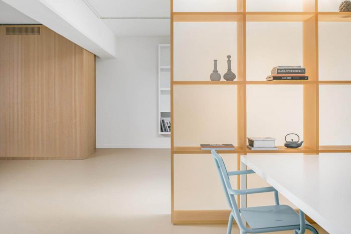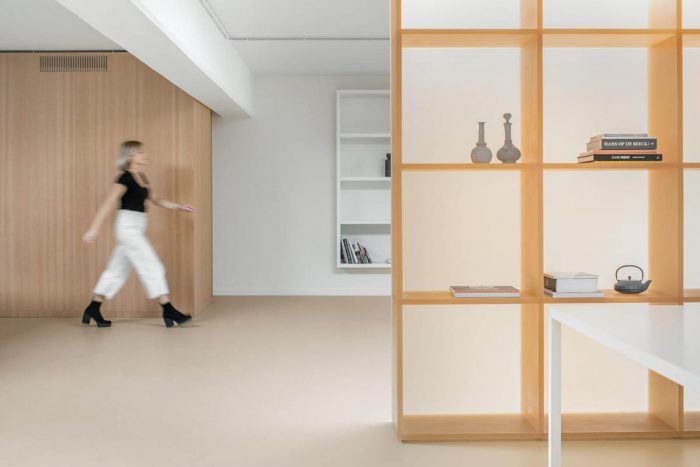 The former office space on the upper floor of an industrial building in Brussels was transformed into an apartment for an artist. Three main interventions were made in the open space: a central cupboard in translucent polyester resin, a kitchen in dark marble and two symmetrical wooden volumes containing bedrooms and storage space. This project is the result of an intense research of materials: light and dark marble, experiments with different shades of polyester resin, different types of wood and different shades of the cast floor.