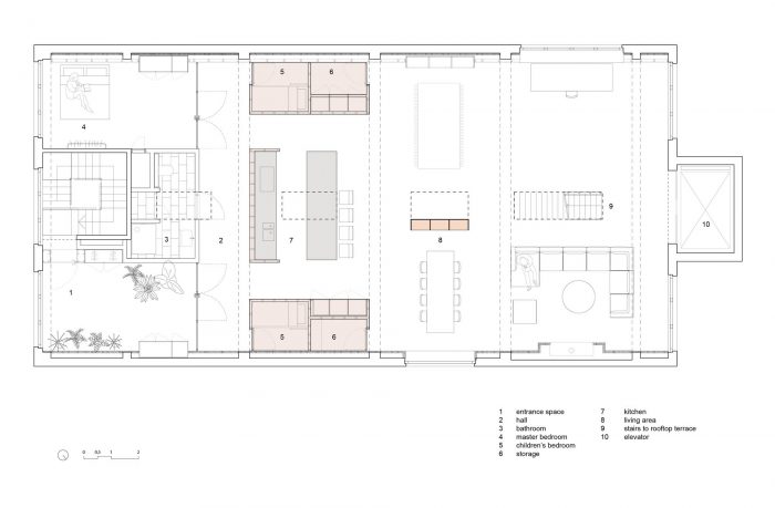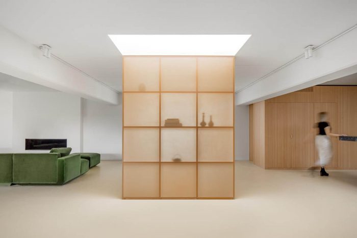 The two wooden volumes strengthen this symmetry in a light non-bearing structure. The type of wood complements the warmth of the cast floor and the translucent cupboard. The two new skylights inside the children’s bedrooms create an intimate and comfortable space to sleep. In the dining area a new opening was made in the outer wall to create a broad view on the city.