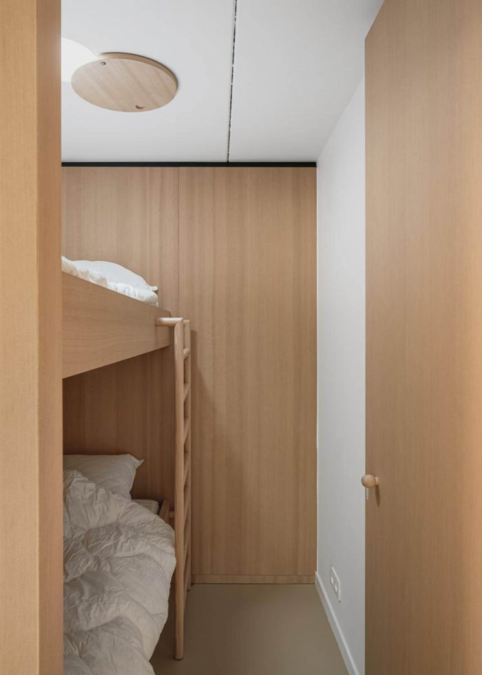 两个木制的体量在一个轻盈的非承重结构中加强了这种对称性。木材的类型补充了铸造地板和半透明橱柜的温暖。儿童卧室内的两个新天窗创造了一个亲密而舒适的睡眠空间。在用餐区,在外墙做了一个新的开口,以创造一个广阔的城市视野。