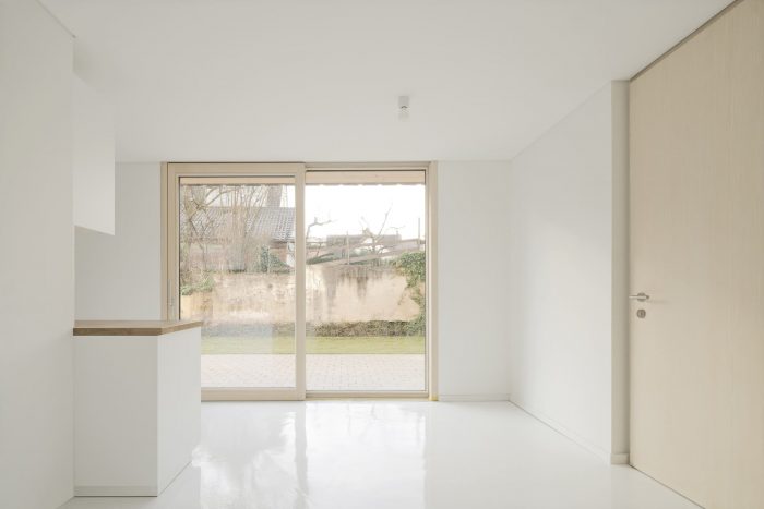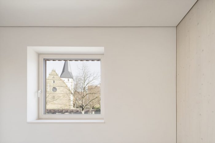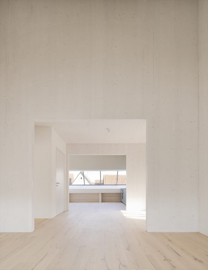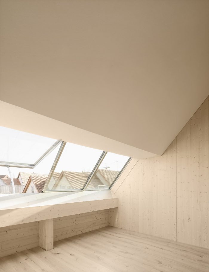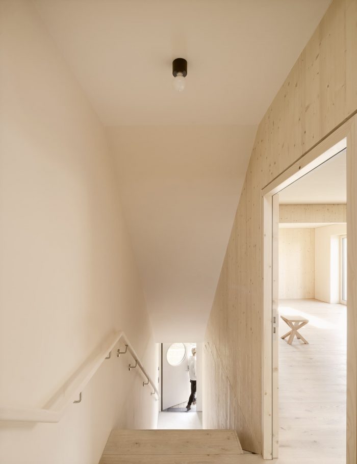 On the first floor, the house is divided lengthwise, on the second crosswise. This division is also legible in the interior: For example, the structure of spruce wood and the loam in the apartment facing the center of the village were painted white, while they were left untreated in the one facing the garden. But this division is also subtly visible in the silver fir facade: The widths of the planks in the board and batten cladding vary slightly in the two halves of the house thus giving a hint of the interior.