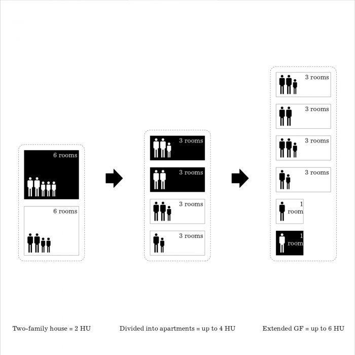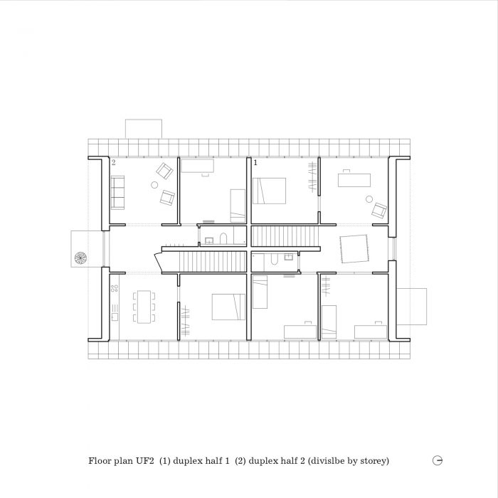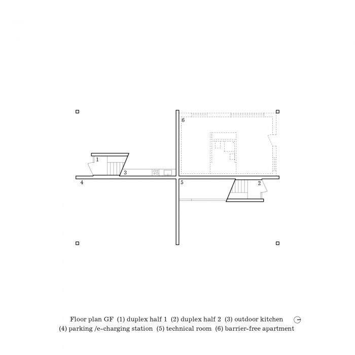 简单的基本形式掩盖了一个复杂的嵌套式半独立式住宅,其中两个住宅单元都通过一个楼梯连接到花园层。这意味着,公寓的入口门都位于底层。在所有的楼层中,住宅单元都是按点反射来组织的,这样所有的住户都可以从所有四个方向的景色中受益: 这意味着从每间公寓都能看到东边的教堂广场,西边的花园,北边的葡萄园,南边的村庄屋顶,都能看到远处的风景。