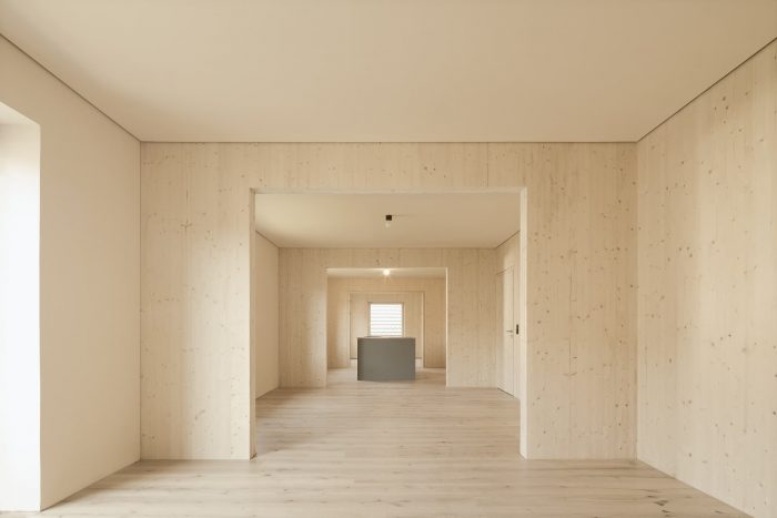 在第一层,房子是纵向划分的,第二层是横向划分的。这种划分在室内也是清晰可见的: 例如,面向村庄中心的公寓的云杉木结构和黄土被涂成白色,而面向花园的公寓则未作处理。但这种划分在银杉的外墙上也能巧妙地看到: 木板和压条覆层的宽度在房子的两半中略有不同,从而给人以内部的暗示。