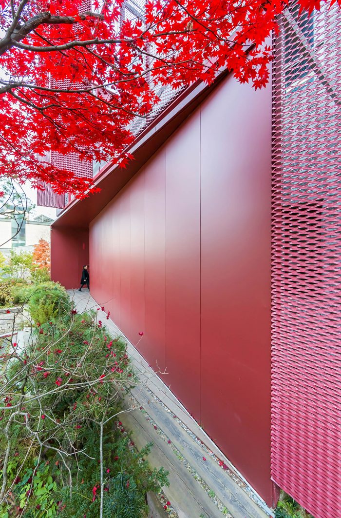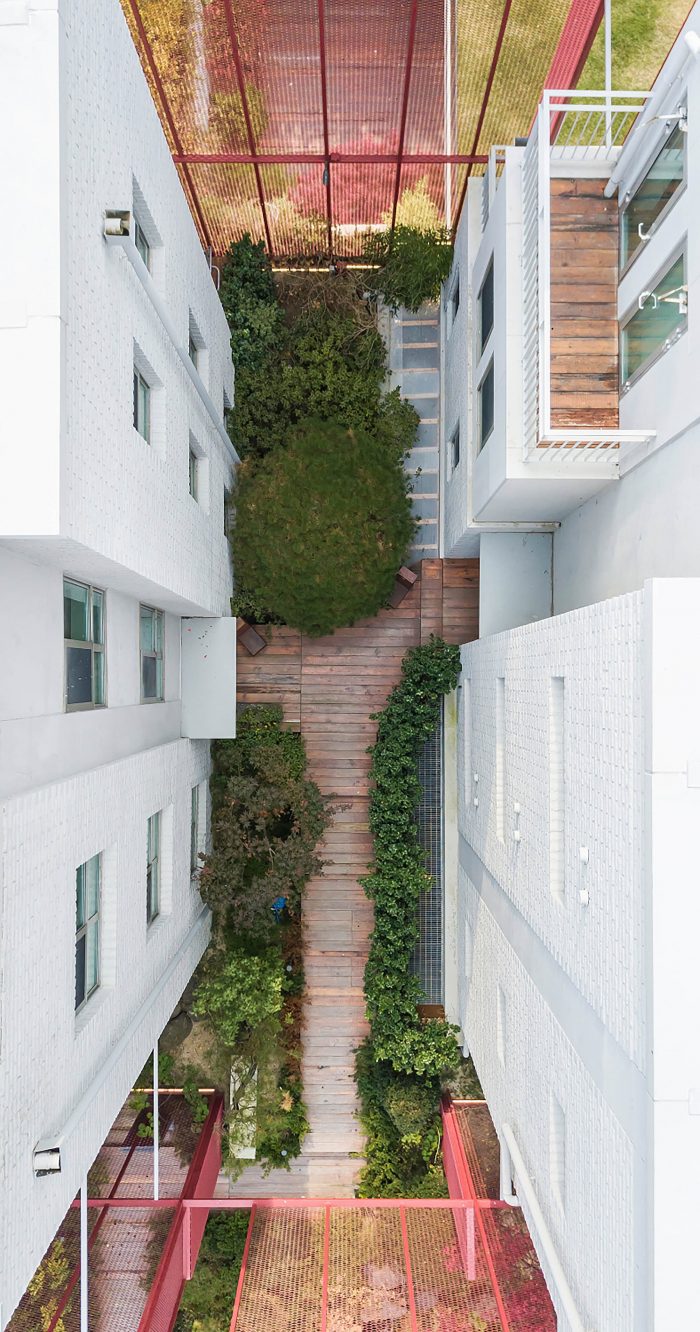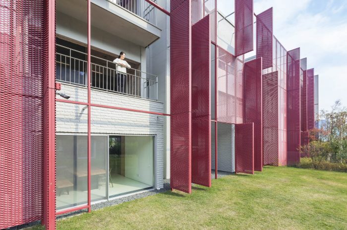 The expanded metal screen allows controlled daylight penetration to the premise yet keeping consistent ventilation. The screen which is a monumental identity to the office first unites the individual mass together as a whole entity. Despite the unified visual by using the screen, bold movement in creating various openings allowed what has been there originally to better inform its existence. We wanted the screen to be part of the core mechanism in flooding the interiors with nature that it is surrounded by. An almost translucent filter; the screen seemed to be the perfect material in raising a unique dialogue between the old and the new by fundamentally becoming a transitional pivot..