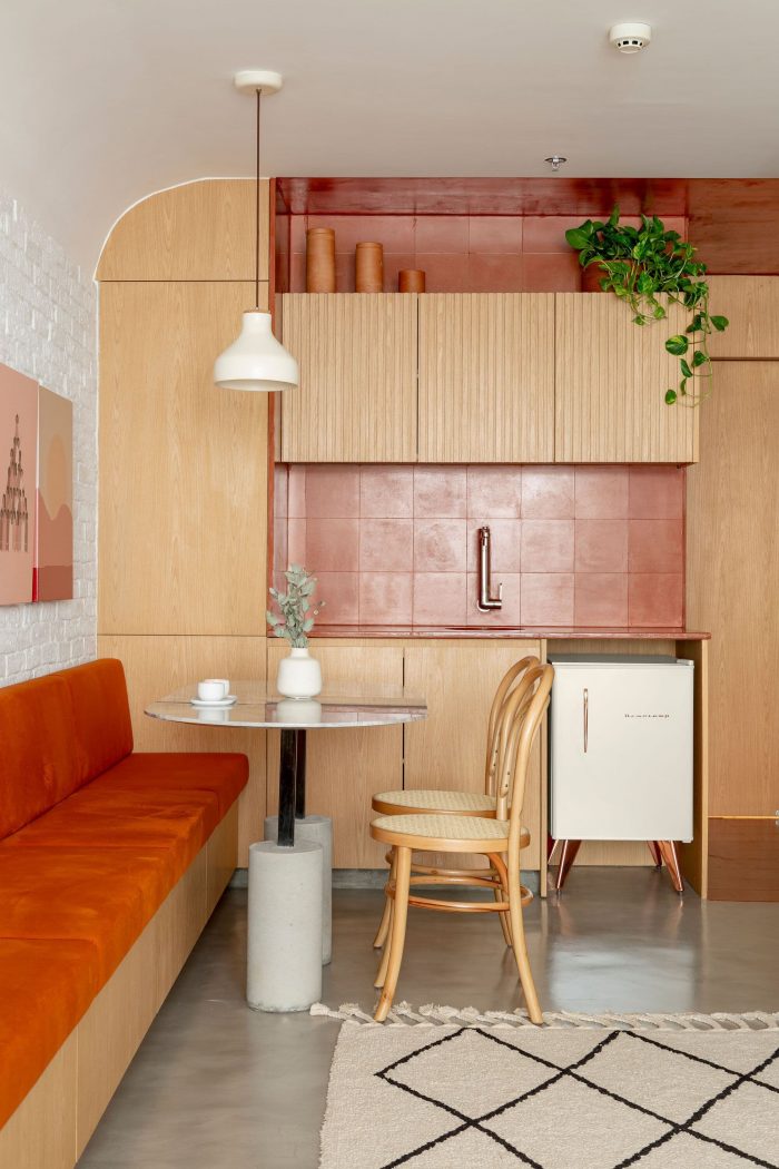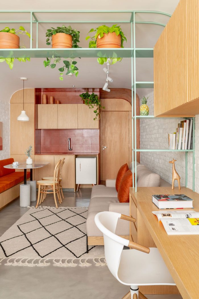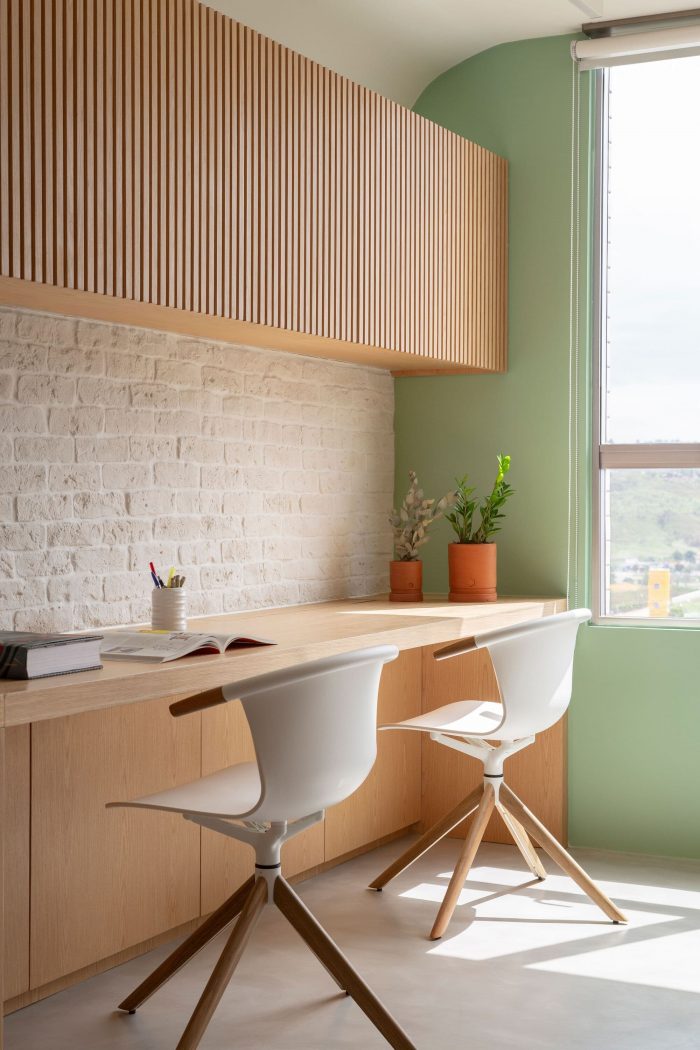 The benches were positioned symmetrically close to the window to receive greater ventilation and natural sunlight, enhancing the framing of the exterior landscape. The kitchenette and social area, located closer to the entrance and bathroom, have multiple functions to optimize space.