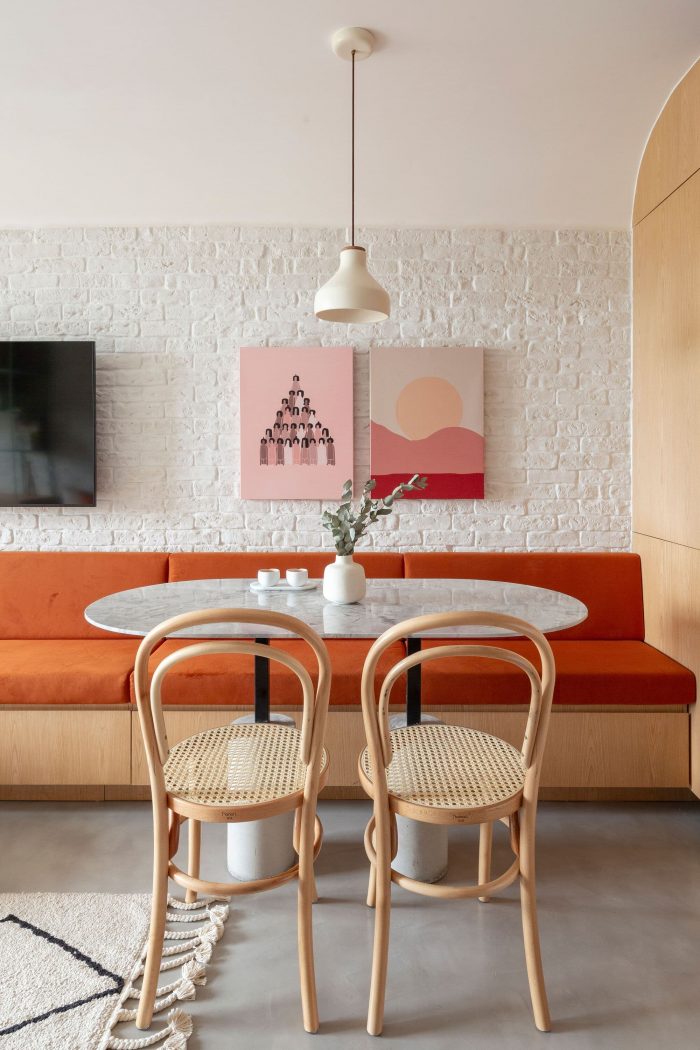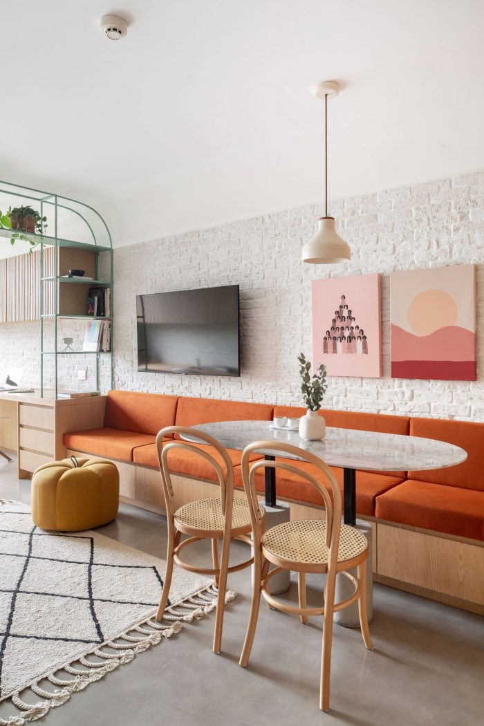The custom-made table is used for both meals and meetings. The bench, in addition to having lower drawers, supports the table and extends to accommodate more people sitting in the living area. The sofa and TV are part of the moments of leisure and relaxation, but also serve to host clients and deliver presentations in a comfortable and casual way.