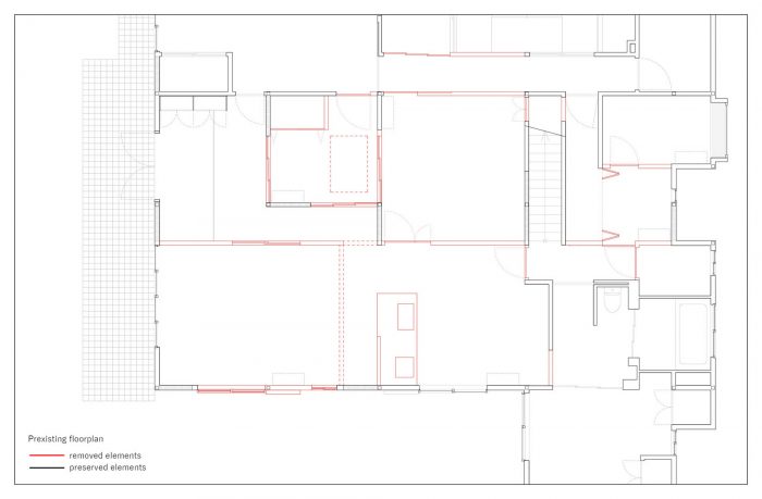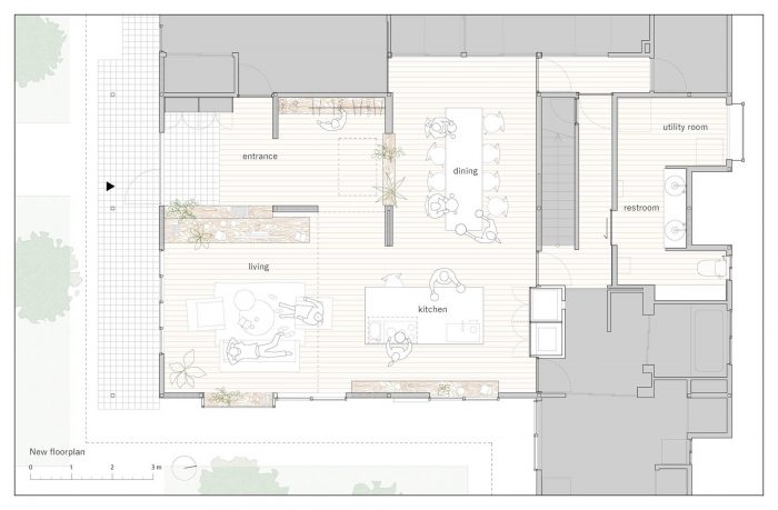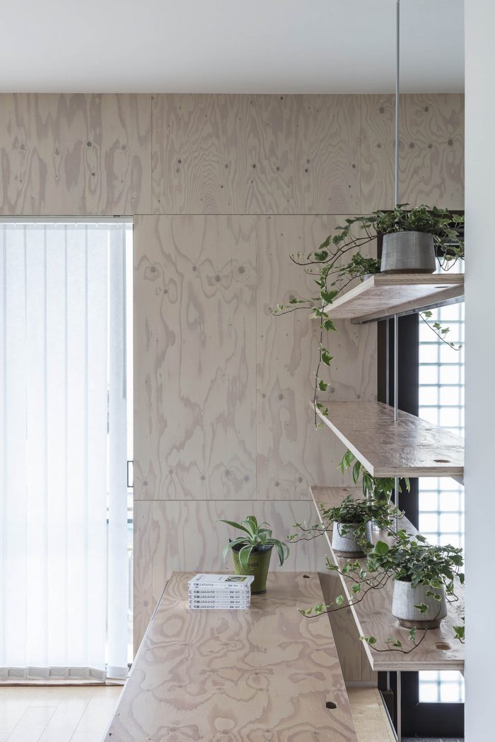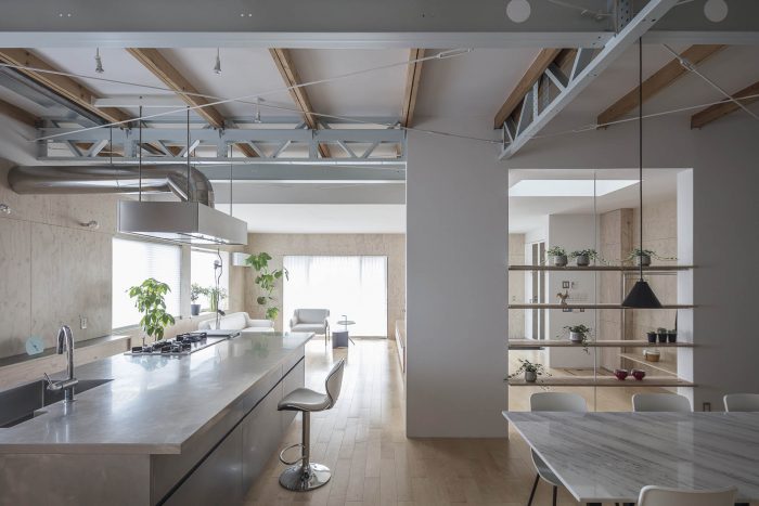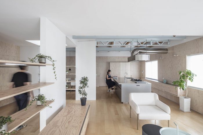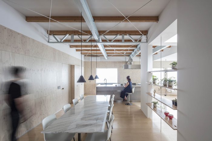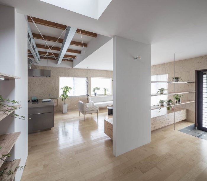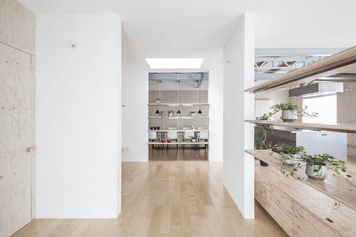 The house was initially subdivided into numerous small, rather dark rooms. The proposal clears away most of the walls to create an open space and removes the existing ceiling to increase its height, partially exposing the steel beams. This continuous space is softly articulated to create the entrance, kitchen, dining, and living zones. Thin hanging shelves separate the entrance from the other zones. Views from the entrance can be conveniently filtered and adjusted by the number, type, and position of the objects standing on the shelves.