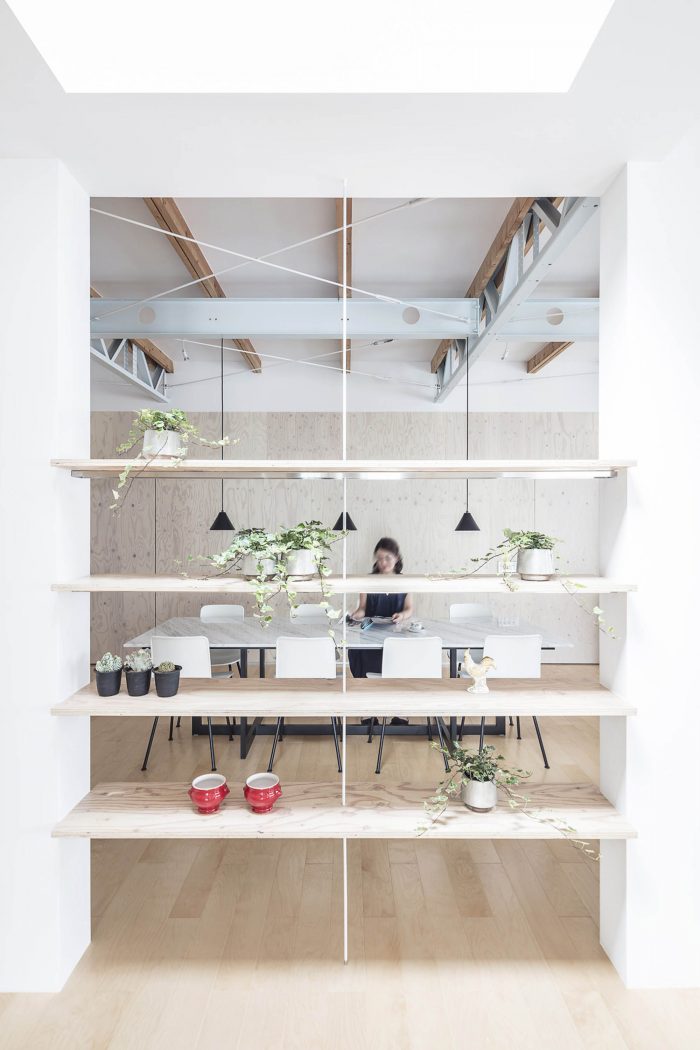 这座房子最初被分割成许多小的、相当黑暗的房间。该提案清除了大部分墙壁,创造了一个开放的空间,并拆除了现有的天花板以增加其高度,部分地暴露了钢梁。这个连续的空间被柔和地衔接起来,形成入口、厨房、餐厅和生活区。薄薄的挂架将入口与其他区域分开。来自入口处的视线可以通过架子上物体的数量、类型和位置来方便地过滤和调整。