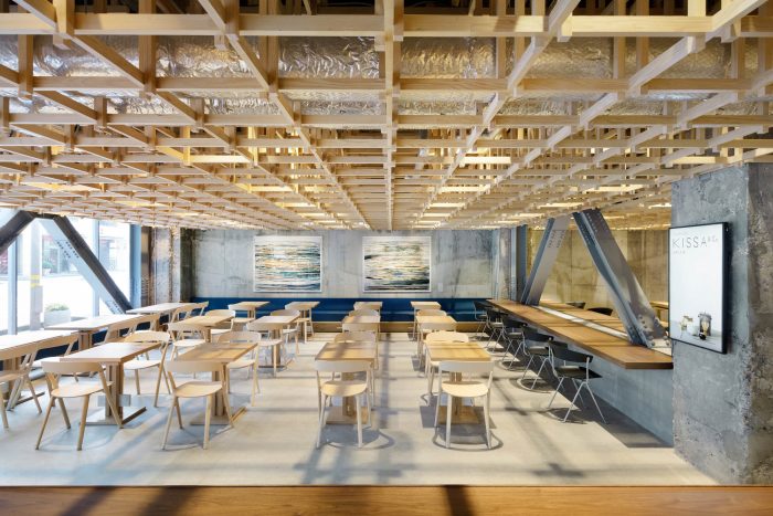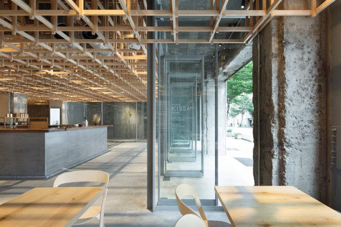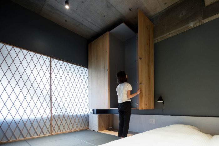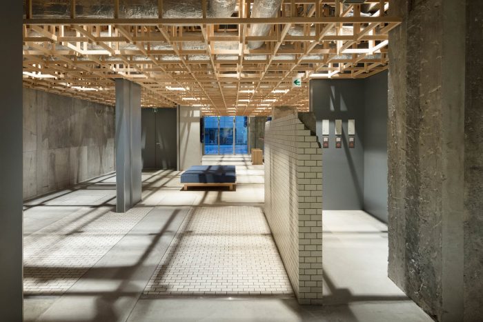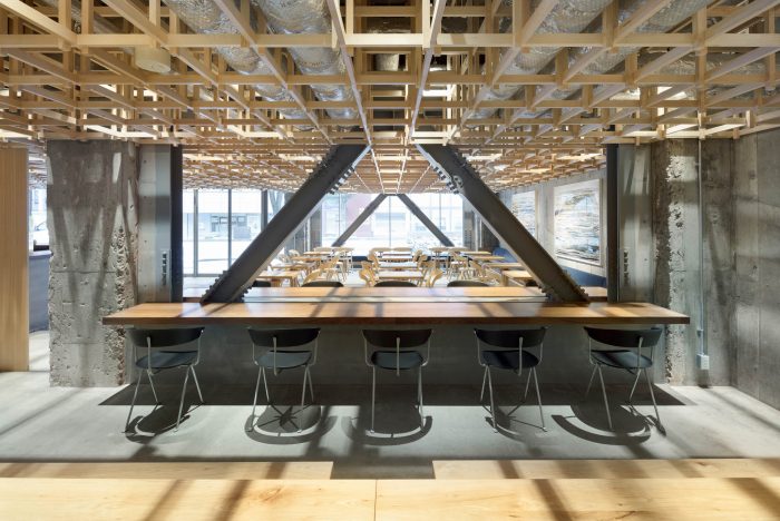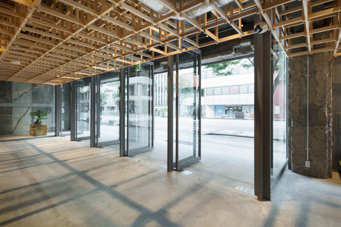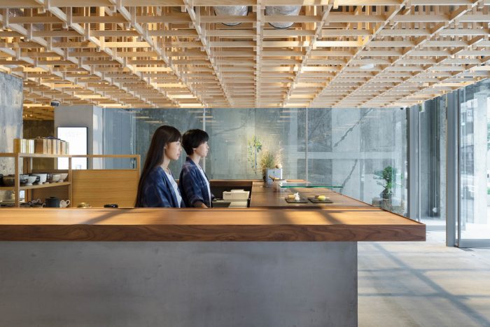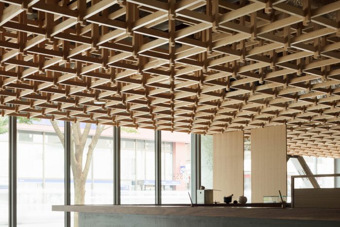 This concept leads to a hotel that is inclusive and engaged with its context. Housed in a renovated office building, the hotel includes options ranging from dormitories to suites to accommodate the diverse needs of travelers today. In dialogue with Kanazawa’s tea houses, a tea salon on the ground floor “joins” the hotel to the community and entices guests to explore other places in the city. “Kumu” also appears in other places. Traditional Japanese joinery was used for the timber grid in the lobby, which also serves to support modular wall panels for subdividing the space. The custom-designed furniture joins different textures and materials, while the screens in the guest rooms feature grid-like detailing.