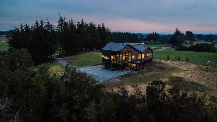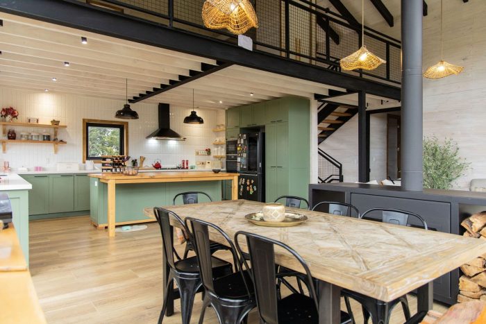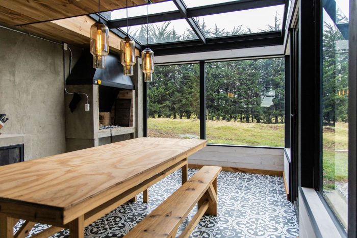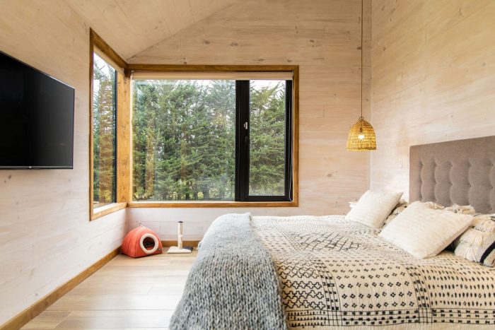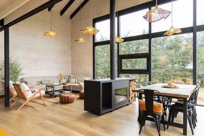 卧室、厨房、客厅、餐厅、洗衣房和浴室都位于这一层。这种层次的游戏,再加上东北面的大窗户,可以在树梢的高度上看到卡尔布科火山的特权。最后,在三楼,有一个开放的夹层,可以俯瞰主空间,供游客使用。