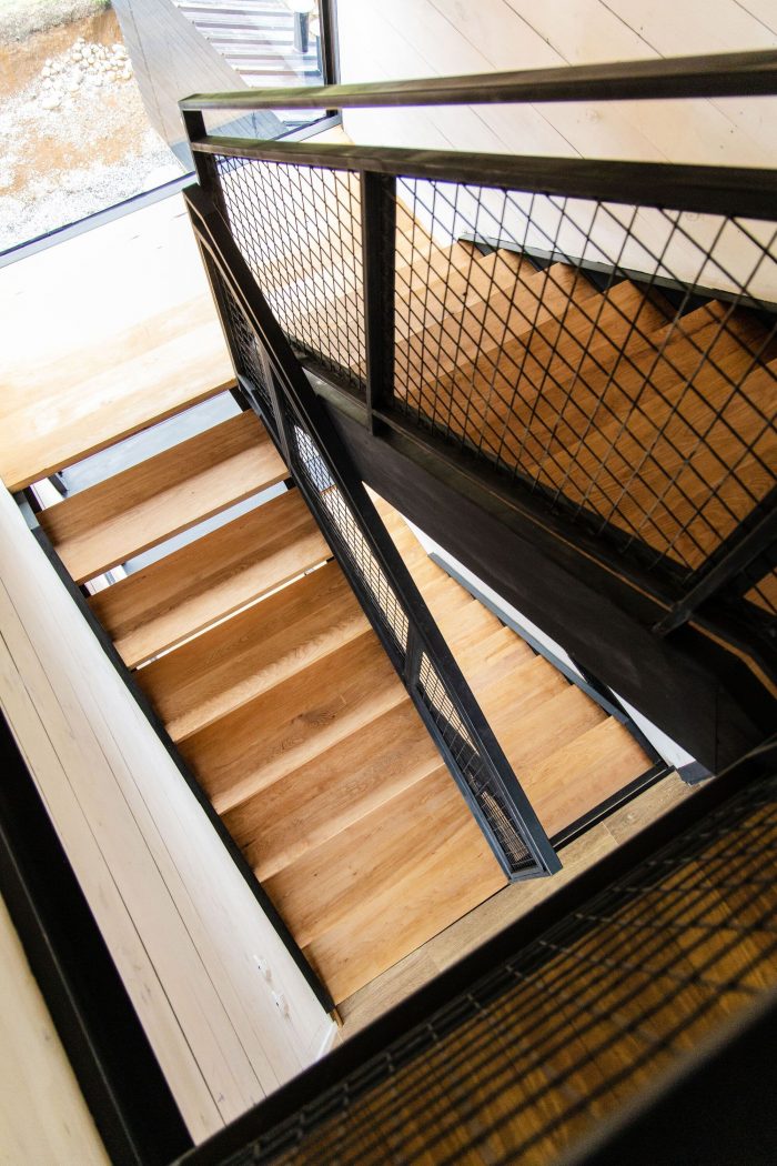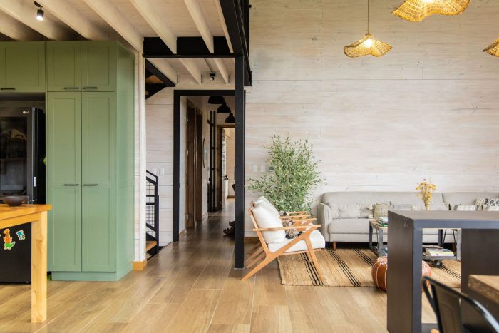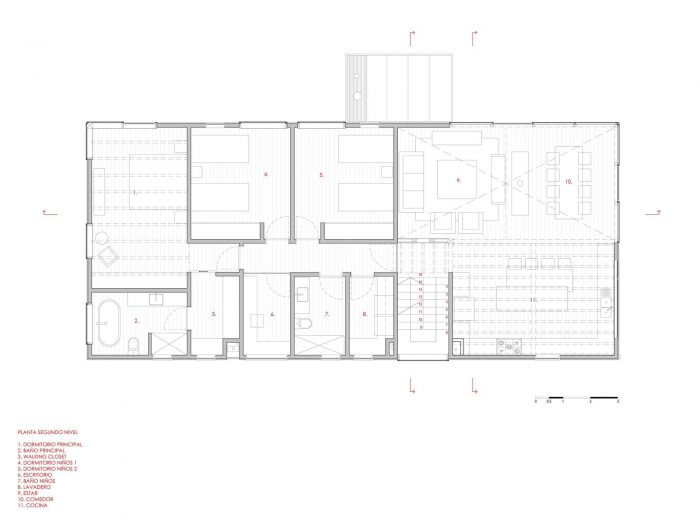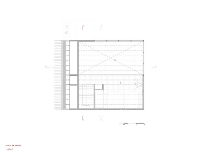 The bedrooms, kitchen, living room, dining room, laundry room, and bathrooms are located on this floor. This play of levels, added to a large northeast window, allows for a privileged view of the Calbuco volcano at the height of the treetops. Finally, on the third floor, there is an open mezzanine that overlooks the main space, intended for visitors.