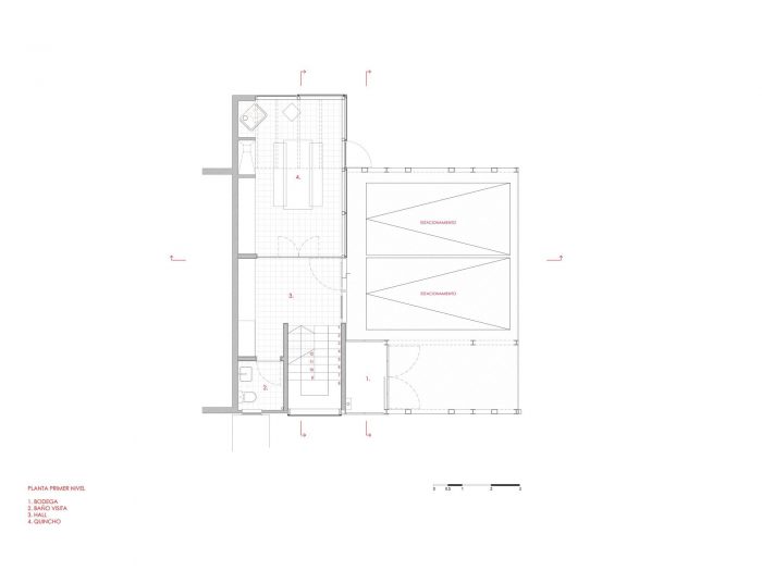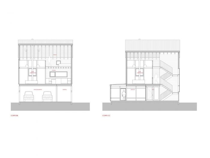 To achieve this, the uses of the house are divided by floors. On the first floor, in the lower part of the lot, we locate the access and parking lots, accompanied by a barbecue area that integrates directly with the natural level of the lot. Thus we achieve a flexible circulation of visitors and access protected from rain.