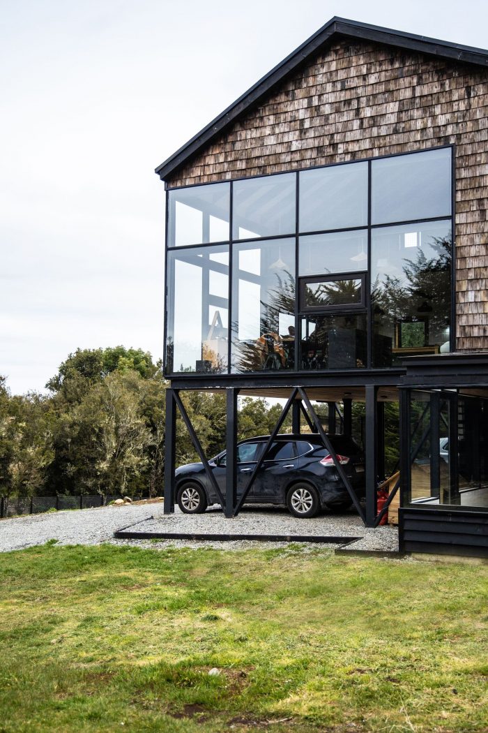 The materiality of the house contrasts a contemporary steel structure, a necessary structure to achieve the covered parking and to support the large volume, combined with the traditional wood construction of the area.