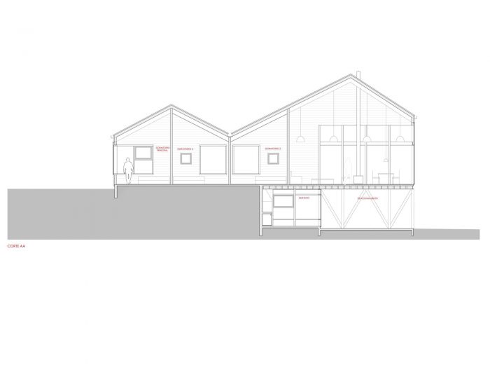 The main floor, or floor 2, is located on top of the access, creating the covered space of the entrance. This main level, whose proportions are rather elongated, rests on the highest point of the lot, which is why it has one sector at the natural level, while another sector acts as the cover for floor 1.
