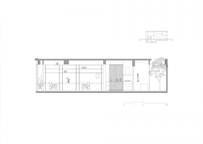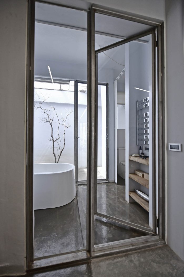 To increase the flexibility of the space, we removed the original interior partition walls, changed the front façade, and opened the roof of the backyard to make it into a courtyard. It helps to bring the air and the light back into the interior space. Then we set up the bathing transparent glass box right beside the courtyard connecting to interior space to make it a larger hierarchical courtyard for living space.