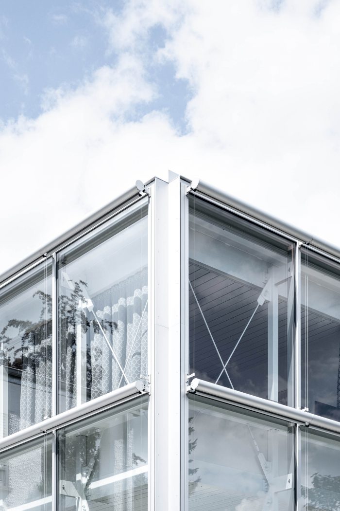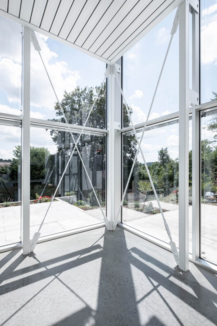 The textile sunshade forms a second level that protects the glass building envelope from overheating in the summer like a veil, while at the same time allowing a view of the garden. Curtains create privacy when needed.