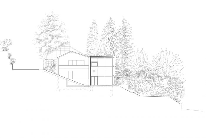 The realized design, therefore, removes the staircase, which was perceived as a spatial barrier, opens the living spaces to each other and adds to the solid building, which was partially demolished, on the valley side a steel skeleton structure enclosed in glass in an east-south-west direction, which makes the actual quality of the site tangible and accessible: The flowing living space in the middle of the slightly overgrown garden interwoven with lush vegetation.