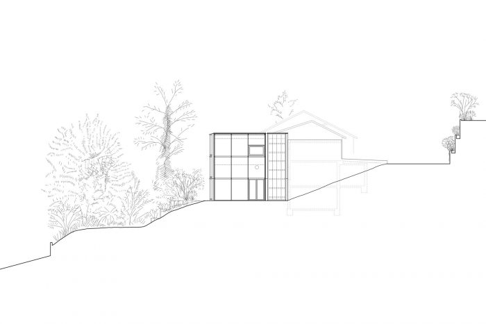 因此,实现的设计去掉了被认为是空间障碍的楼梯,使生活空间相互开放,并在被部分拆除的实体建筑的基础上,在山谷一侧增加了一个东西向的用玻璃围合的钢结构骨架,使场地的实际质量变得有形且易于接近。流动的生活空间在略显杂乱的花园中间,与茂盛的植被交织在一起。