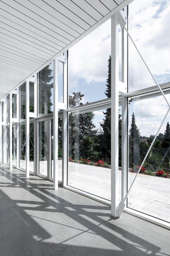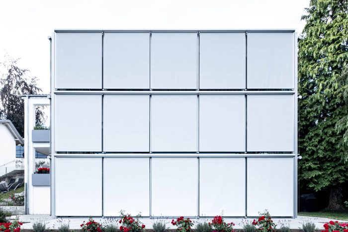 The various components of the supporting structure, facade, sunshade, and privacy screen create a fabric-like, spatially deep, ephemeral structure that changes depending on the time of year and day, the form of use, and the mood of the light.