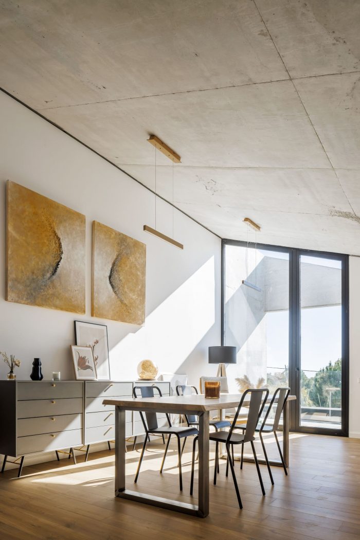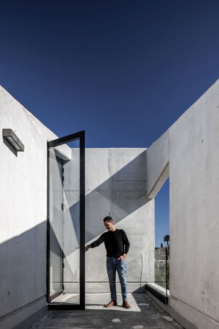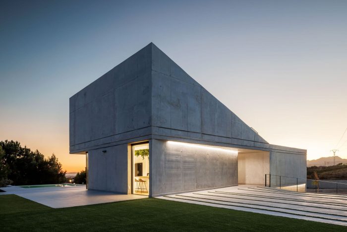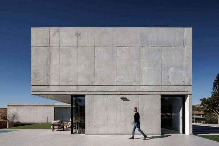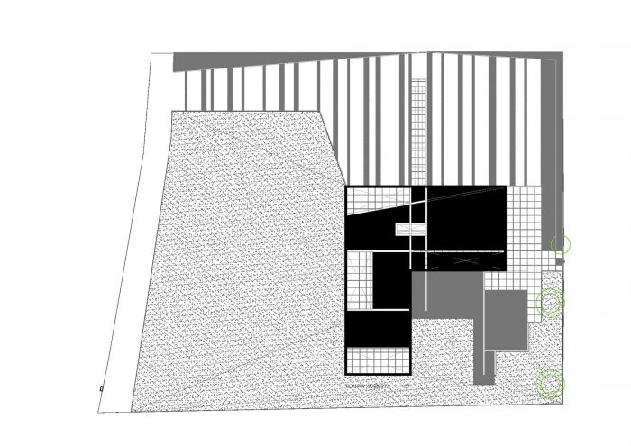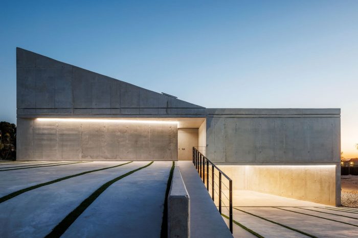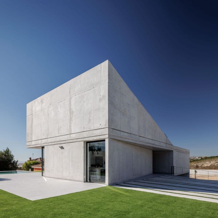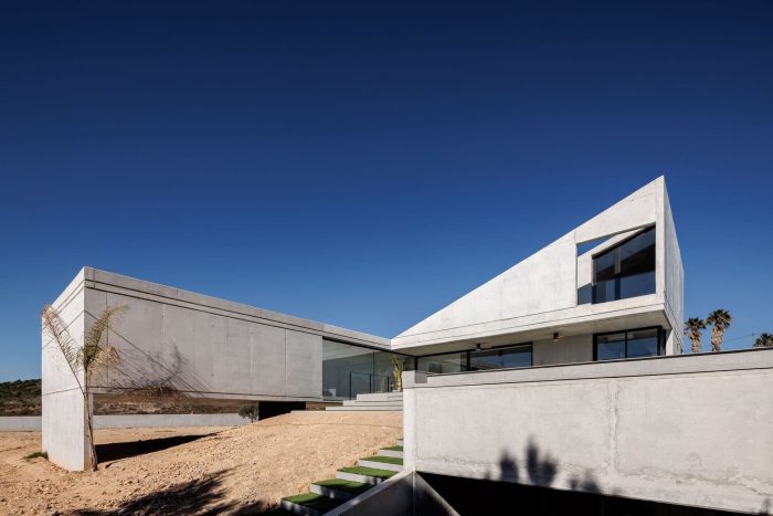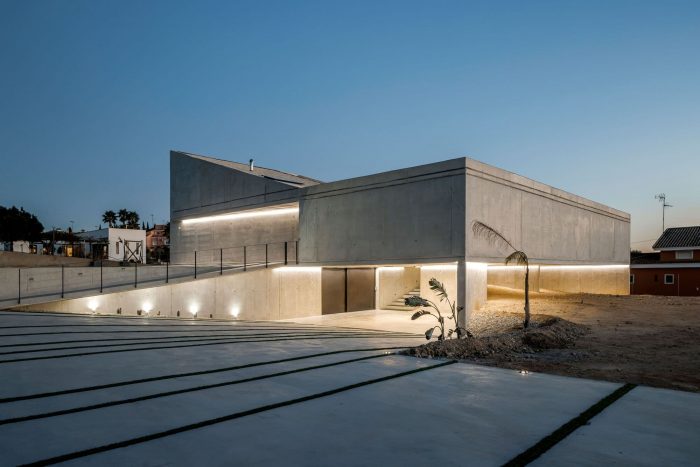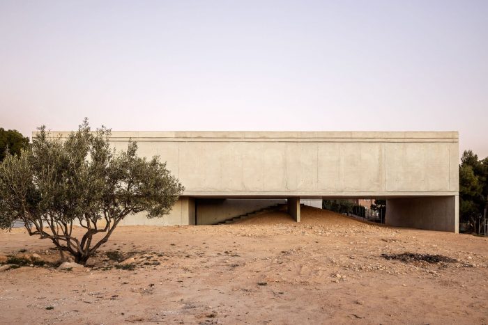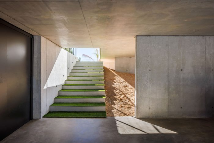 The concrete allows solving the resounding response to the exterior of the project while creating the possibility that the building meets the ground punctually, naturally assimilating the artificial orography created on the plot so that there is continuity between the different levels. The concrete and its own construction determine the shape of the building while allowing it to be molded plastically so that the transition between the different heights is continuous and not divided by means of an orthodox superimposition of floors.