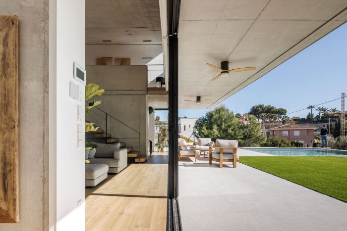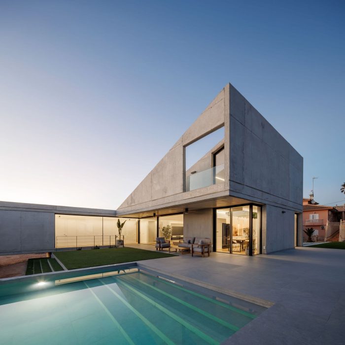 In this sense, the main facade is transformed into a large 24-meter edge beam capable of flying over the ground, creating a shaded area below it and hiding behind it the most intimate spaces of the habitat. Subsequently, it accommodates the access by means of a ramp that continues with the idea of giving spatial continuity to the exterior elements while allowing a leisurely view of the access and its opening to the landscape of the distant city. In its encounter with the day area, the enclosure disappears and is transformed into large-format glass elements, thus resolving an immediate interior-exterior relationship.