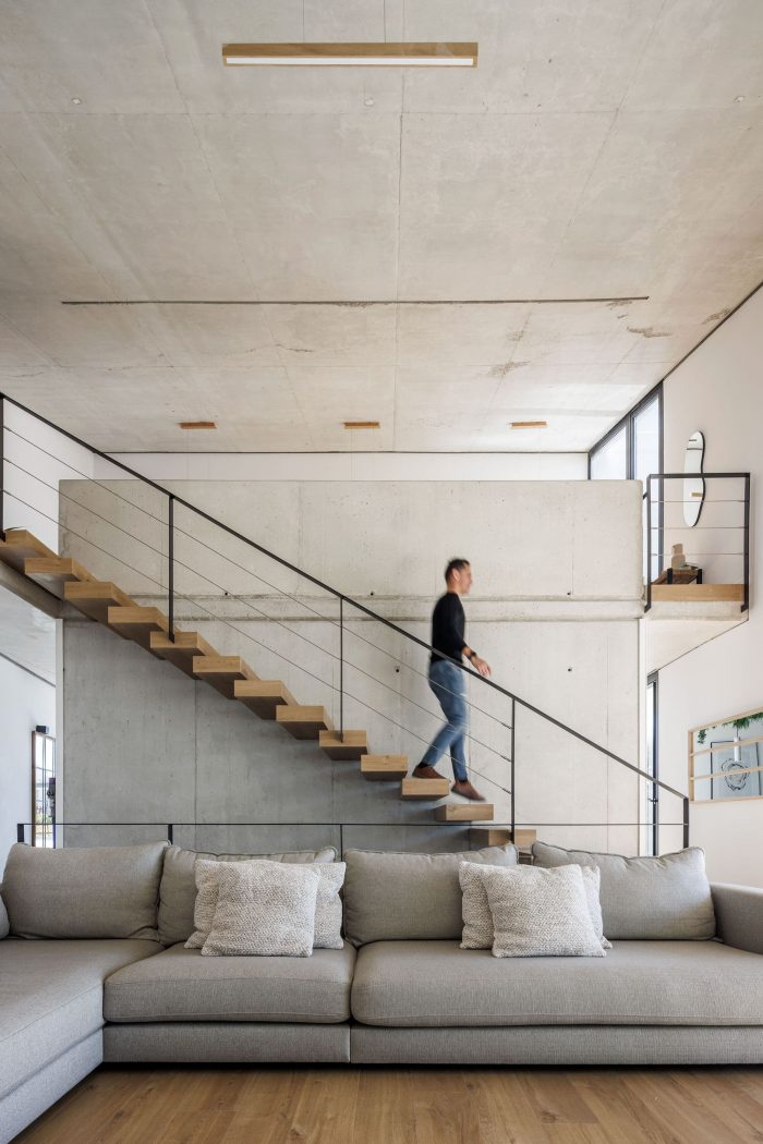 在这个意义上,主立面被转化为一个24米长的大型边梁,能够飞越地面,在它下面形成一个阴影区,并在它后面隐藏着居住区最私密的空间。随后,它通过一个坡道来容纳通道,该坡道延续了赋予外部元素空间连续性的想法,同时允许悠闲地观看通道和它对远处城市景观的开放。在与日间区域的接触中,围墙消失了,变成了大尺寸的玻璃元素,从而解决了一个直接的内部和外部关系。